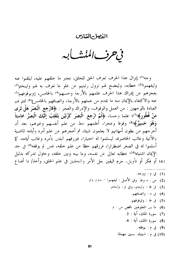 وجه إنزال هذا الحرف تعرف الحق للخلق، بمعتبر ما خلقهم عليه، ليلقنوا عنه وليفهموا خطابه، وليتضح لهم نزول رتبتهم عن علو ما تعرف به لهم ولينختم بعجزهم عن إدراك هذا الحرف علمهم بالأربعة وحسهم بالخامس، [وبوقوفهم عنه والاكتفاء بالإيمان منه ما تقدم من عملهم بالأربعة، واتصافهم بالخامس] لتتم لهم العبادة بالوجهين: من العمل والوقوف، والإدراك والعجز: {فَارْجِعِ الْبَصَرَ هَلْ تَرَى مِنْ فُطُورٍ}؛ علما وحسا، {ثُمَّ ارْجِعِ الْبَصَرَ كَرَّتَيْنِ يَنْقَلِبْ إِلَيْكَ الْبَصَرُ خَاسِئًا وَهُوَ حَسِيرٌ} وقوفا وعجزا، أعلمهم بحظ من علم أنفسهم وغيرهم، بعد أن أخرجهم من بطون أمهاتهم لا يعلمون شيئا، ثم أعجزهم عن علم أمره وأيامه الماضية الآتية وغائب الحاضرة، ليسلموا له اختيارا، فيرزقهم اليقين بأمره وغائب أيامه، كما أسلموا له في الصغر اضطرارا، فرزقهم حظا من علم خلقه، فمن لم يوقفه في حد الإيمان اشتباه خطابه تعالى عن نفسه، وما بينه وبين خلقه، وحاول تدركه بدليل أو فكر أو تأويل، حرم اليقين بعلى الأمر والتحقيق في علم الخلق، وأخذ بما أضاع