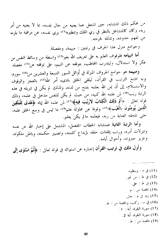 ومبهمه هو جوامع الحروف المنزلة في أوائل السور التسعة والعشرين من سوره، وبه افتتح الترتيب في القرآن، ليلقى الخلق بادئ أمر الله بالعجز والوقوف والاستسلام، إلى أن يمن الله بعلمه بفتح من لدنه، ولذلك لم يكن في تنزيله في هذه الرتبة ريب لمن علمه الله كنهه، من حيث لم يكن للنفس مدخل في علمه، وذلك قوله تعالى: {الم (1) ذَلِكَ الْكِتَابُ لَا رَيْبَ فِيهِ} لمن علمه الله إياه {هُدًى لِلْمُتَّقِينَ (2) الَّذِينَ يُؤْمِنُونَ بِالْغَيْبِ} وقوفا عن محاولة علم ما ليس في وسع الخلق علمه، حتى تلحقه العناية من ربه، فيعلمه مالم يكن يعلم.