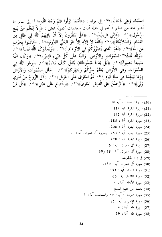 السَّمَاءِ وَهِيَ دُخَانٌ} إلى قوله: {فَأَيْنَمَا تُوَلُّوا فَثَمَّ وَجْهُ اللَّهِ} إلى سائر ما أخبر عنه من عظيم شأنه، في جملة آيات متعددات كقوله تعالى: {إِلَّا لِنَعْلَمَ مَنْ يَتَّبِعُ الرَّسُولَ} {فَإِنِّي قَرِيبٌ} {هَلْ يَنْظُرُونَ إِلَّا أَنْ يَأْتِيَهُمُ اللَّهُ فِي ظُلَلٍ مِنَ الْغَمَامِ وَالْمَلَائِكَةُ} {اللَّهُ لَا إِلَهَ إِلَّا هُوَ الْحَيُّ الْقَيُّومُ}. {فَأْذَنُوا بِحَرْبٍ مِنَ اللَّهِ} {هُوَ الَّذِي يُصَوِّرُكُمْ فِي الْأَرْحَامِ} {وَيُحَذِّرُكُمُ اللَّهُ نَفْسَهُ} {وَلِلَّهِ مُلْكُ السَّمَاوَاتِ وَالْأَرْضِ وَاللَّهُ عَلَى كُلِّ شَيْءٍ قَدِيرٌ} {وَكَانَ اللَّهُ سَمِيعًا بَصِيرًا}. {بَلْ يَدَاهُ مَبْسُوطَتَانِ يُنْفِقُ كَيْفَ يَشَاءُ} {وَهُوَ اللَّهُ فِي السَّمَاوَاتِ وَفِي الْأَرْضِ يَعْلَمُ سِرَّكُمْ وَجَهْرَكُمْ}. {خَلَقَ السَّمَاوَاتِ وَالْأَرْضَ وَمَا بَيْنَهُمَا فِي سِتَّةِ أَيَّامٍ ثُمَّ اسْتَوَى عَلَى الْعَرْشِ}. {قُلِ الرُّوحُ مِنْ أَمْرِ رَبِّي}. {الرَّحْمَنُ عَلَى الْعَرْشِ اسْتَوَى}. {وَلِتُصْنَعَ عَلَى عَيْنِي} {قُلْ مَنْ