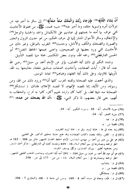 أَنْ يَشَاءَ اللَّهُ} {وَجَاءَ رَبُّكَ وَالْمَلَكُ صَفًّا صَفًّا} إلى سائر ما أخبر فيه عن تنزلات أمره وتسوية خلقه، وما أخبر عنه حبيبه محمد، - صلى الله عليه وسلم -، من محفوظ الأحاديث التي عرف بها أمته ما يحملهم في عبادتهم على الانكماش والجد والخشية والوجل والاشفاق، وسائر الأحوال المشار إليها في حرف المحكم، من نحو حديث النزول والنعلين والصورة والضحك والكف والأنامل، وحديث التقرب بالنوافل، وغير ذلك من الأحاديث التي ورد بعضها في الصحيحين، واعتنى بجمعها الحافظ المتفنن أبو الحسين الدارقطني رحمه الله، ودون بعض المتكلمين جملة منها لمقصد التأويل.