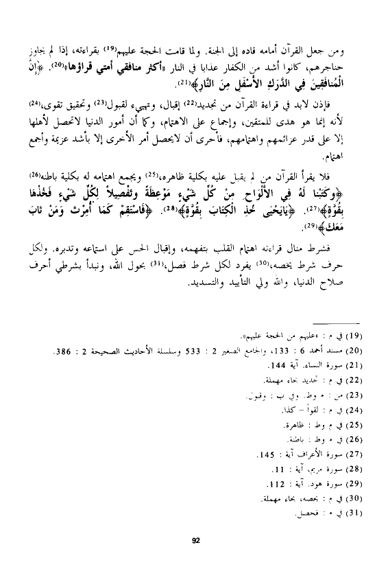 فلا يقرأ القرآن من لم يقبل عليه بكلية ظاهره، ويجمع اهتمامه له بكلية باطنه {وَكَتَبْنَا لَهُ فِي الْأَلْوَاحِ مِنْ كُلِّ شَيْءٍ مَوْعِظَةً وَتَفْصِيلًا لِكُلِّ شَيْءٍ فَخُذْهَا بِقُوَّةٍ}. {يَا يَحْيَى خُذِ الْكِتَابَ بِقُوَّةٍ}. (فَاسْتَقِمْ كَمَا أُمِرْتَ وَمَنْ تَابَ مَعَكَ}.