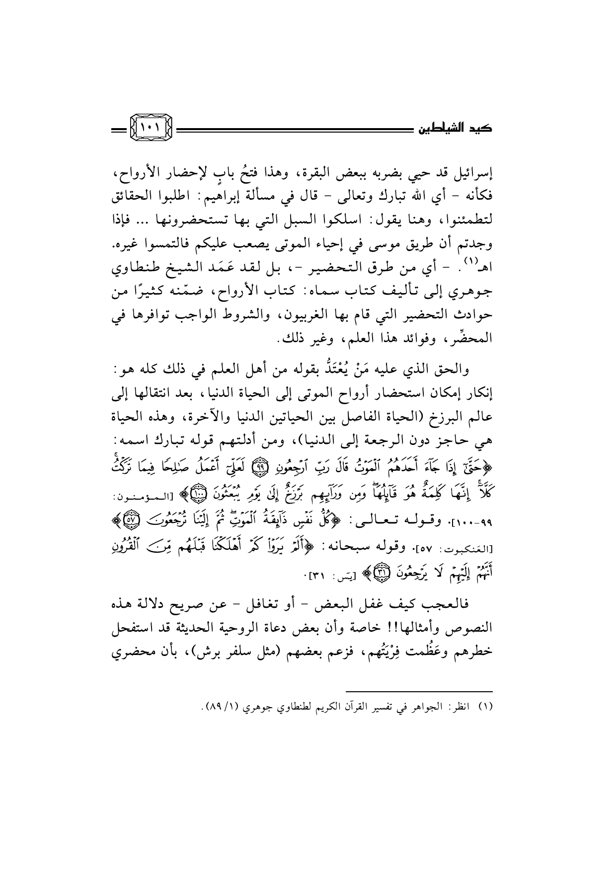 إسرائيل قد حيي بضربه ببعض البقرة، وهذا فتحُ بابٍ لإحضار الأرواح، فكأنه - أي الله تبارك وتعالى - قال في مسألة إبراهيم: اطلبوا الحقائق لتطمئنوا، وهنا يقول: اسلكوا السبل التي بها تستحضرونها ... فإذا وجدتم أن طريق موسى في إحياء الموتى يصعب عليكم فالتمسوا غيره. اهـ (¬1) . - أي من طرق التحضير -، بل لقد عَمَد الشيخ طنطاوي جوهري إلى تأليف كتاب سماه: كتاب الأرواح، ضمّنه كثيرًا من حوادث التحضير التي قام بها الغربيون، والشروط الواجب توافرها في المحضِّر، وفوائد هذا العلم، وغير ذلك.