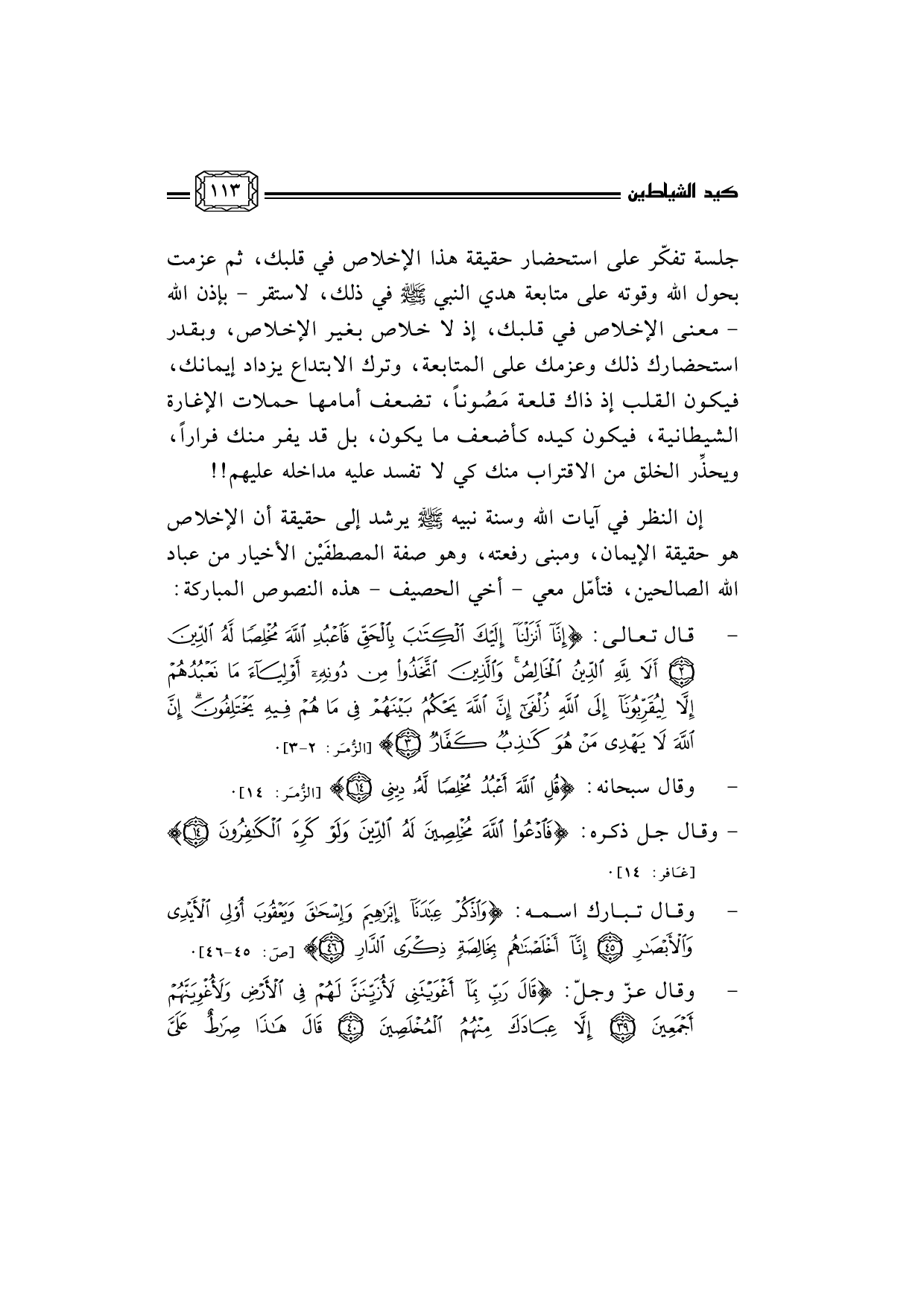 جلسة تفكّر على استحضار حقيقة هذا الإخلاص في قلبك، ثم عزمت بحول الله وقوته على متابعة هدي النبي صلى الله عليه وسلم في ذلك، لاستقر - بإذن الله - معنى الإخلاص في قلبك، إذ لا خلاص بغير الإخلاص، وبقدر استحضارك ذلك وعزمك على المتابعة، وترك الابتداع يزداد إيمانك، فيكون القلب إذ ذاك قلعة مَصُوناً، تضعف أمامها حملات الإغارة الشيطانية، فيكون كيده كأضعف ما يكون، بل قد يفر منك فراراً، ويحذِّر الخلق من الاقتراب منك كي لا تفسد عليه مداخله عليهم!!