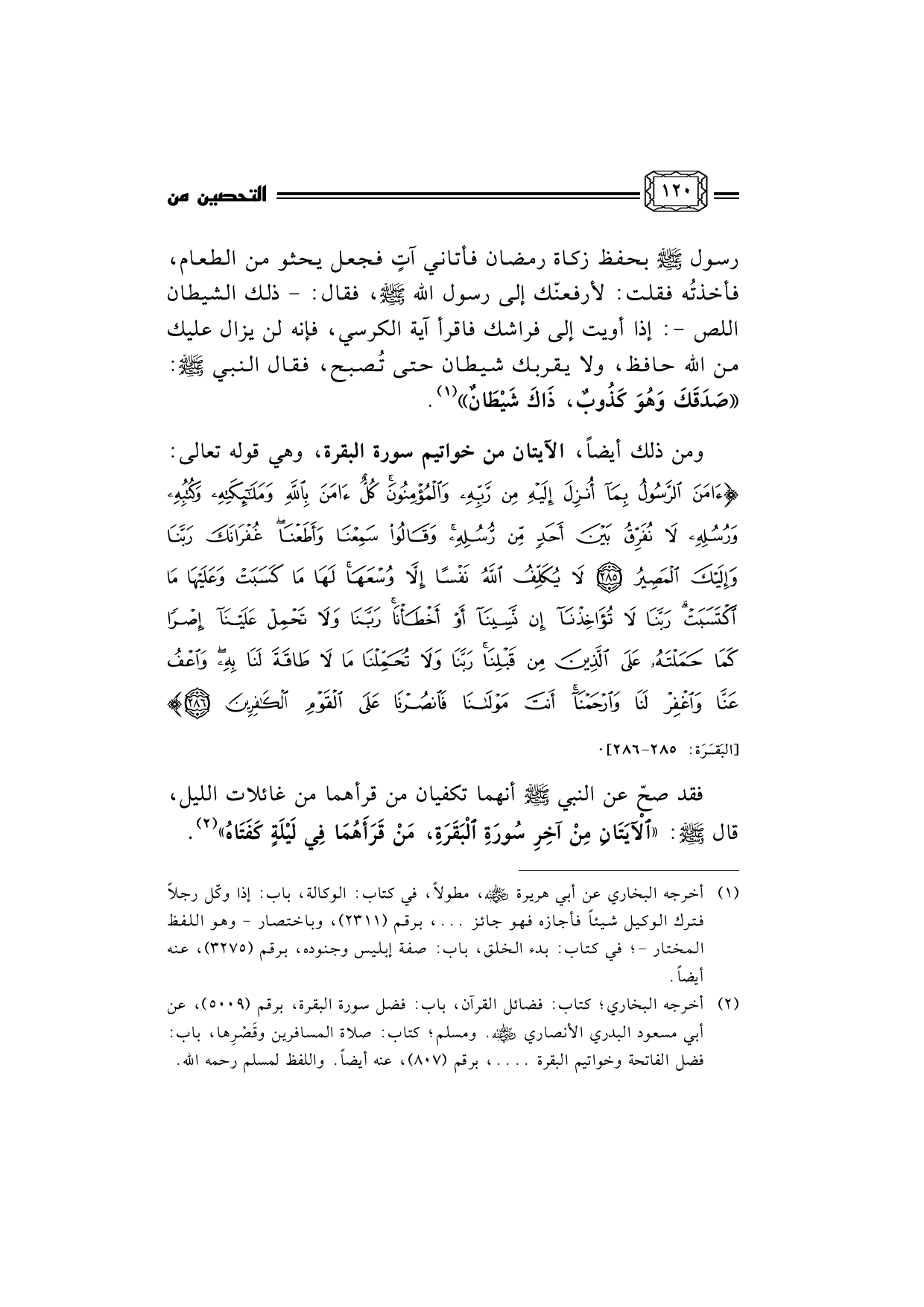 (¬1) أخرجه البخاري عن أبي هريرة رضي الله عنه، مطولاً، في كتاب: الوكالة، باب: إذا وكّل رجلاً فترك الوكيل شيئاً فأجازه فهو جائز ... ، برقم (2311) ، وباختصار - وهو اللفظ المختار -؛ في كتاب: بدء الخلق، باب: صفة إبليس وجنوده، برقم (3275) ، عنه أيضاً.