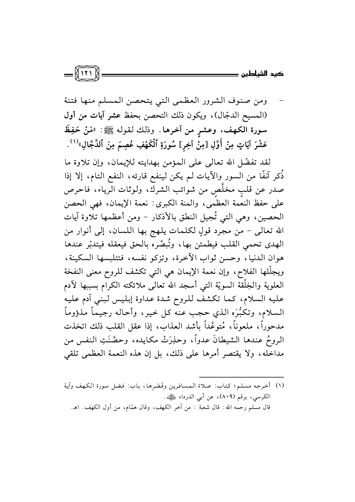 - ... ومن صنوف الشرور العظمى التي يتحصن المسلم منها فتنة (المسيح الدجّال) ، ويكون ذلك التحصن بحفظ عشر آيات من أول سورة الكهف، وعشرٍ من آخرها. وذلك لقوله صلى الله عليه وسلم: «مَنْ حَفِظَ عَشْرَ آيَاتٍ مِنْ أَوَّلِ [مِنْ آخِرِ] سُورَةِ الْكَهْفِ عُصِمَ مِنَ الدَّجَّالِ» (¬1) .