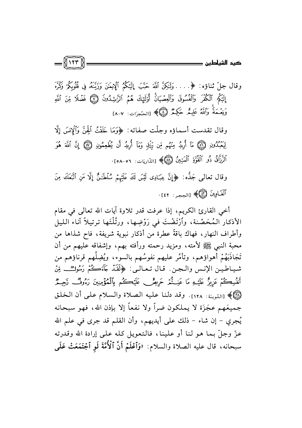 وقال جلّ ثناؤه: [الحُجرَات: 7-8] {.. وَلَكِنَّ اللَّهَ حَبَّبَ إِلَيْكُمُ الإِيمَانَ وَزَيَّنَهُ فِي قُلُوبِكُمْ وَكَرَّهَ إِلَيْكُمُ الْكُفْرَ وَالْفُسُوقَ وَالْعِصْيَانَ أُولَئِكَ هُمُ الرَّاشِدُونَ *فَضْلاً مِنَ اللَّهِ وَنِعْمَةً وَاللَّهُ عَلِيمٌ حَكِيمٌ *}