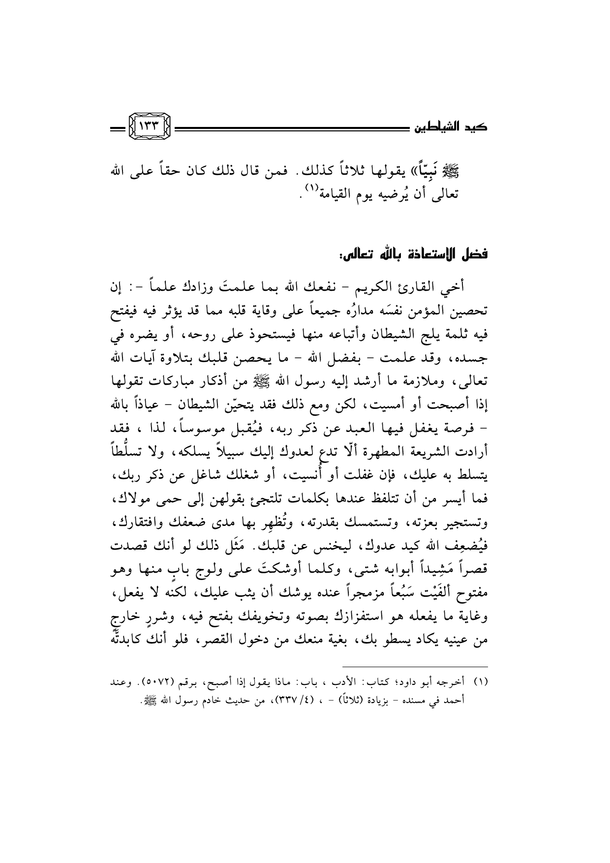 (¬1) أخرجه أبو داود؛ كتاب: الأدب، باب: ماذا يقول إذا أصبح، برقم (5072) . وعند أحمد في مسنده - بزيادة (ثلاثاً) -، (4/337) ، من حديث خادم رسول الله صلى الله عليه وسلم.
