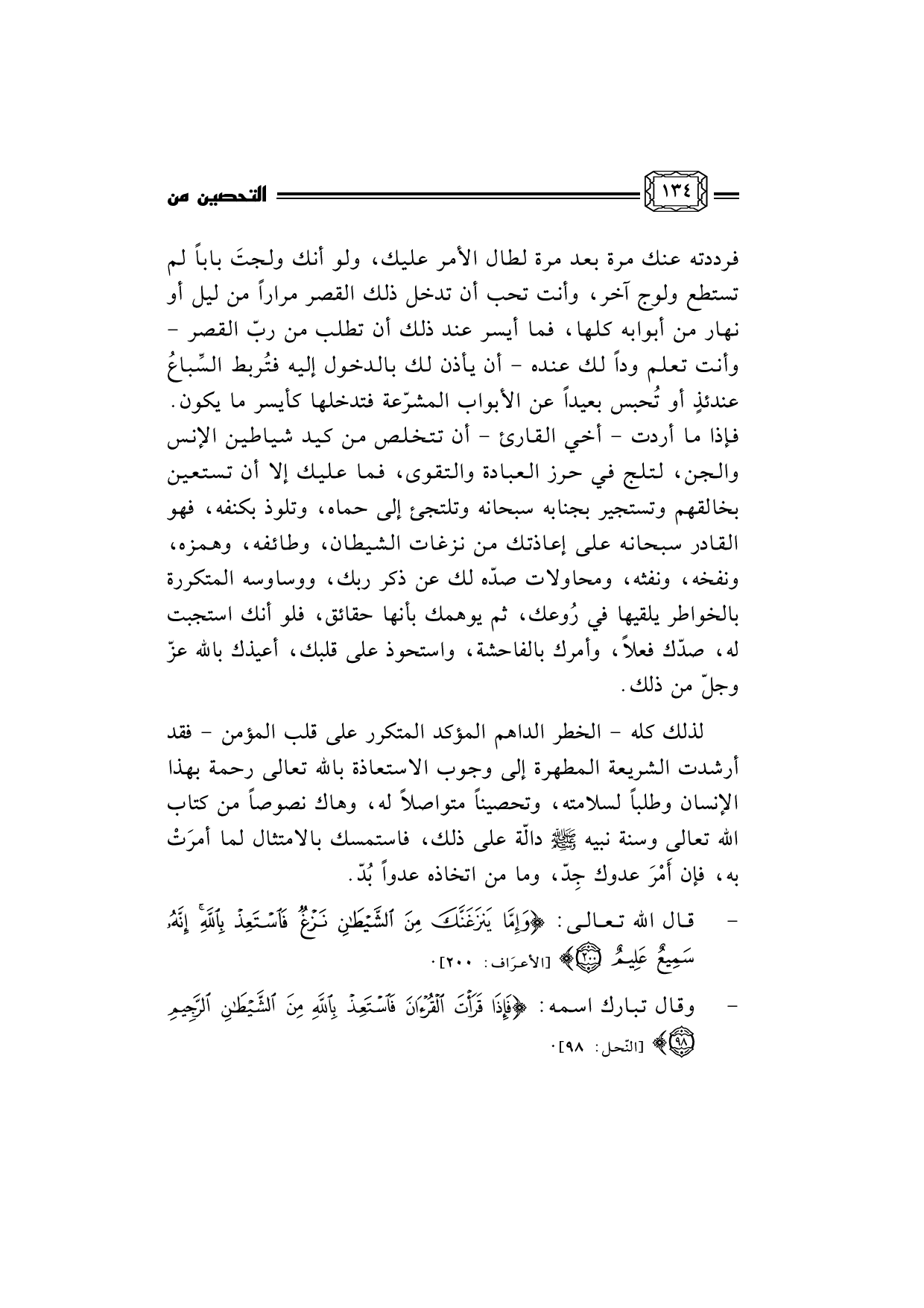 لذلك كله - الخطر الداهم المؤكد المتكرر على قلب المؤمن - فقد أرشدت الشريعة المطهرة إلى وجوب الاستعاذة بالله تعالى رحمة بهذا الإنسان وطلباً لسلامته، وتحصيناً متواصلاً له، وهاك نصوصاً من كتاب الله تعالى وسنة نبيه صلى الله عليه وسلم دالّة على ذلك، فاستمسك بالامتثال لما أمرَتْ به، فإن أَمْرَ عدوك جِدّ، وما من اتخاذه عدواً بُدّ.
