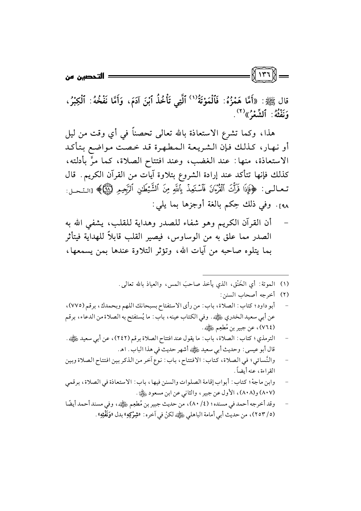 - ... وقد أخرجه أحمد في مسنده؛ (4/80) ، من حديث جبير بن مُطعِم رضي الله عنه، وفي مسند أحمد أيضًا (5/253) ، من حديث أبي أمامة الباهلي رضي الله عنه لكنْ في آخره: «شِرْكِهِ» بدل «وَنَفْثِهِ» .
