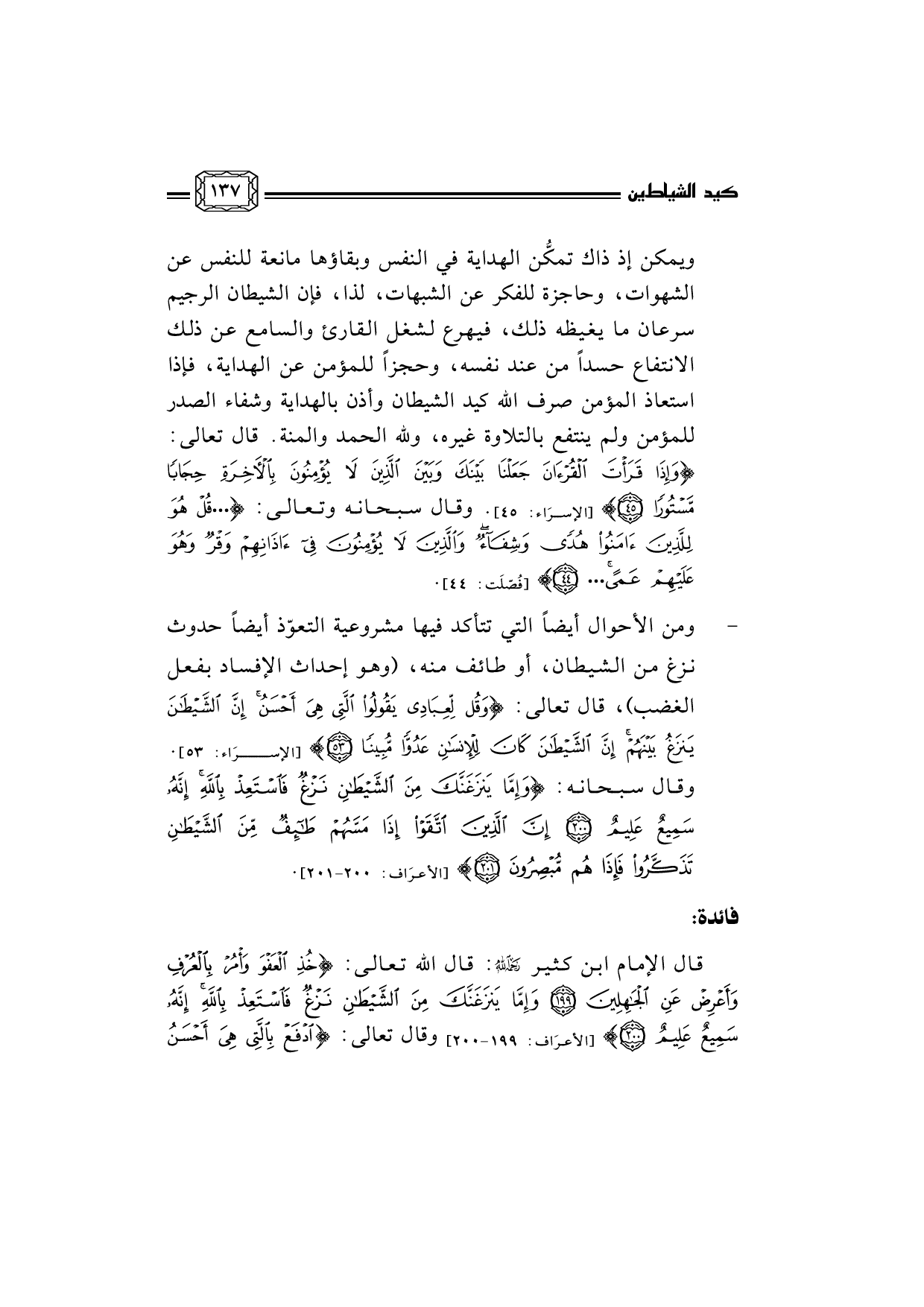 قال الإمام ابن كثير رحمه الله: قال الله تعالى: [الأعرَاف: 199-200] {خُذِ الْعَفْوَ وَأْمُرْ بِالْعُرْفِ وَأَعْرِضْ عَنِ الْجَاهِلِينَ *وَإِمَّا يَنْزَغَنَّكَ مِنَ الشَّيْطَانِ نَزْغٌ فَاسْتَعِذْ بِاللَّهِ إِنَّهُ سَمِيعٌ عَلِيمٌ *} وقال تعالى: [المؤمنون: 96-97] {ادْفَعْ بِالَّتِي هِيَ أَحْسَنُ