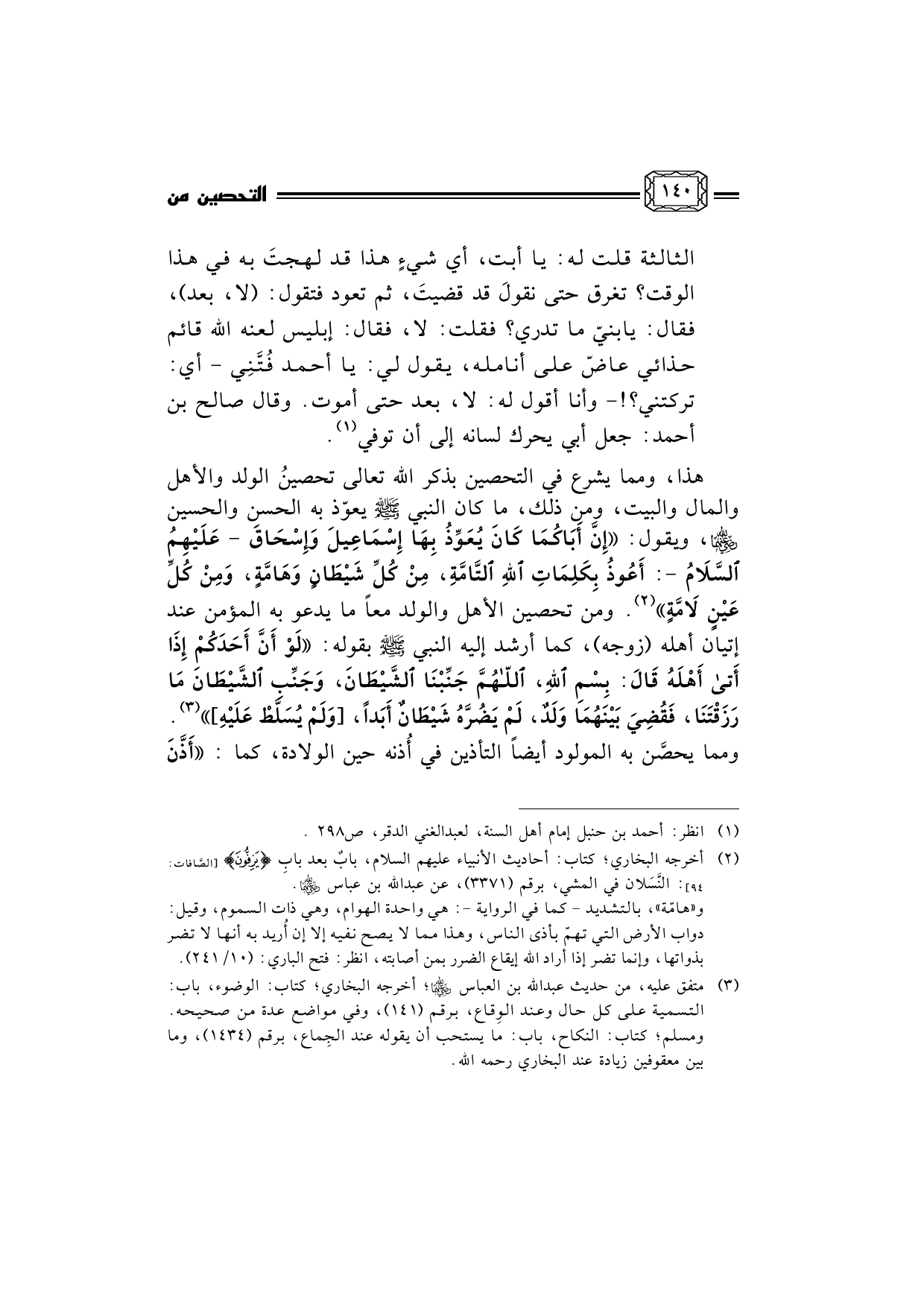هذا، ومما يشرع في التحصين بذكر الله تعالى تحصينُ الولد والأهل والمال والبيت، ومن ذلك، ما كان النبي صلى الله عليه وسلم يعوّذ به الحسن والحسين رضي الله عنهما، ويقول: إِنَّ أَبَاكُمَا كَانَ يُعَوِّذُ بِهَا إِسْمَاعِيلَ وَإِسْحَاقَ - عَلَيْهِمُ السَّلاَمُ -: أَعُوذُ بِكَلِمَاتِ اللهِ التَّامَّةِ، مِنْ كُلِّ شَيْطَانٍ وَهَامَّةٍ، وَمِنْ كُلِّ عَيْنٍ لاَمَّةٍ (¬2) . ومن تحصين الأهل والولد معاً ما يدعو به المؤمن عند إتيان أهله (زوجه) ، كما أرشد إليه النبي صلى الله عليه وسلم بقوله: لَوْ أَنَّ أَحَدَكُمْ إِذَا أَتى أَهْلَهُ قَالَ: بِسْمِ اللهِ، اللهُمَّ جَنِّبْنَا الشَّيْطَانَ، وَجَنِّبِ الشَّيْطَانَ مَا رَزَقْتَنَا، فَقُضِيَ بَيْنَهُمَا وَلَدٌ، لَمْ يَضُرَّهُ شَيْطَانٌ أَبَداً، [وَلَمْ يُسَلَّطْ عَلَيْهِ] (¬3) . ومما يحصَّن به المولود أيضاً التأذين في أُذنه حين الولادة، كما: أَذَّنَ
