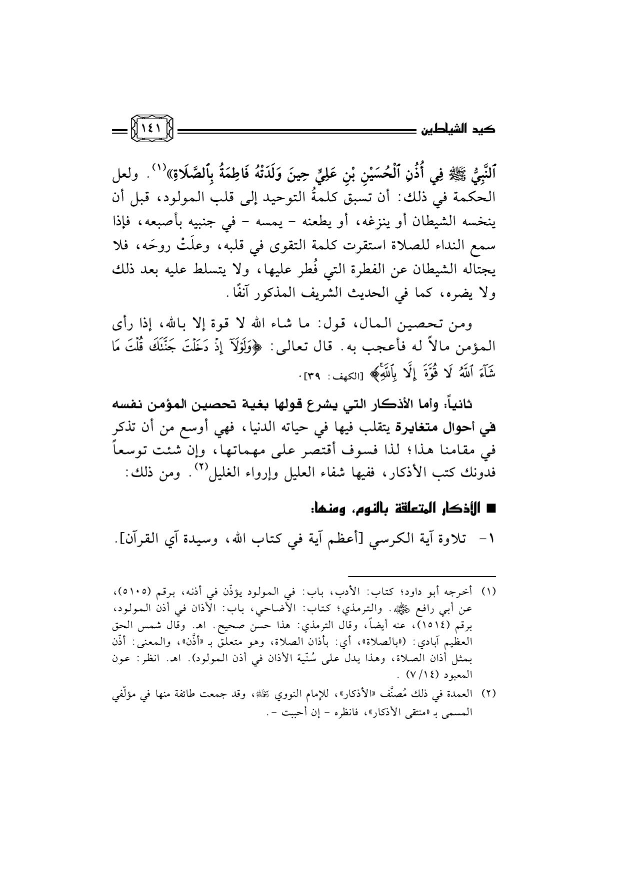 ثانياً: وأما الأذكار التي يشرع قولها بغية تحصين المؤمن نفسه في أحوال متغايرة يتقلب فيها في حياته الدنيا، فهي أوسع من أن تذكر في مقامنا هذا؛ لذا فسوف أقتصر على مهماتها، وإن شئت توسعاً فدونك كتب الأذكار، ففيها شفاء العليل وإرواء الغليل (¬2) . ومن ذلك: