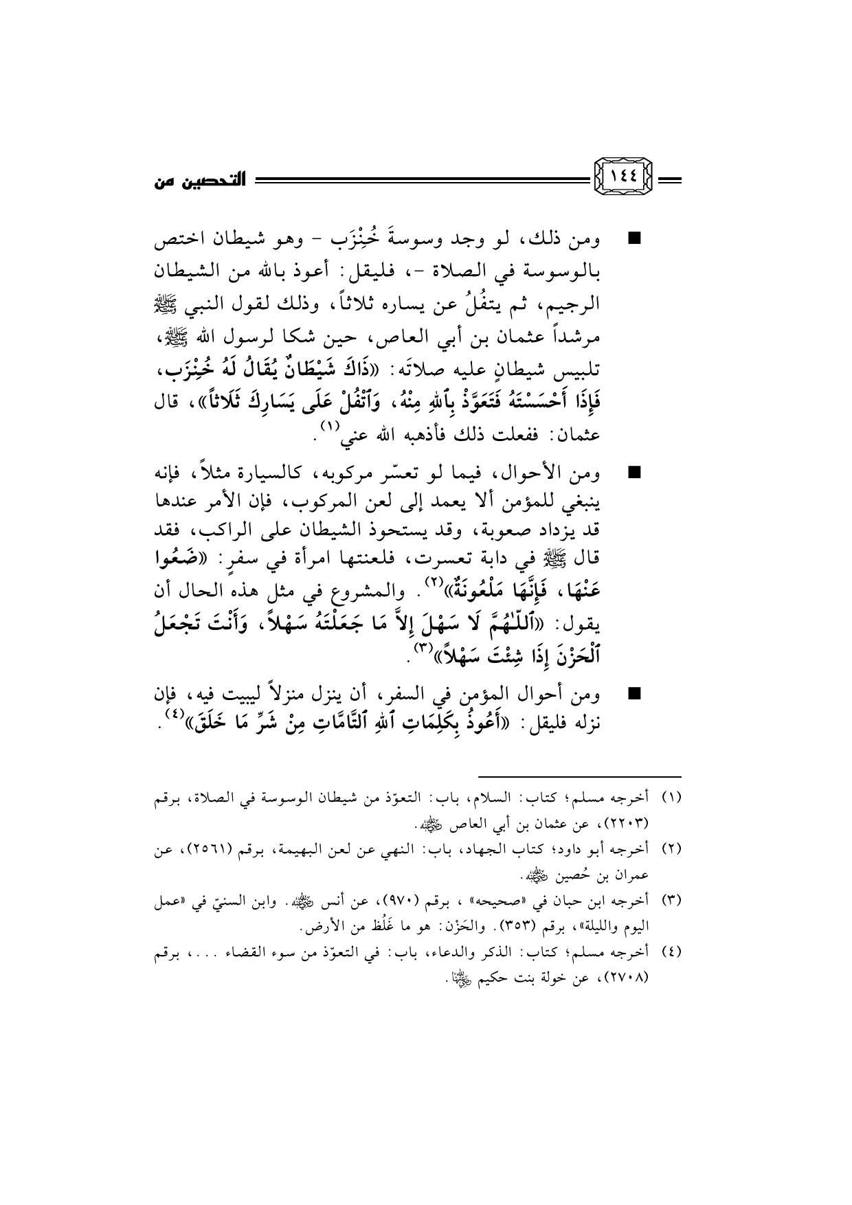 b ... ومن أحوال المؤمن في السفر، أن ينزل منزلاً ليبيت فيه، فإن نزله فليقل: أَعُوذُ بِكَلِمَاتِ اللهِ التَّامَّاتِ مِنْ شَرِّ مَا خَلَق (¬4) .