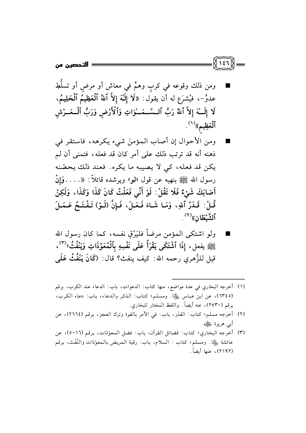 * ... ولو اشتكى المؤمن مرضاً فليَرْقِ نفسه، كما كان رسول الله صلى الله عليه وسلم يفعل، إِذَا اشْتَكَى يَقْرَأُ عَلَى نَفْسِهِ بِالْمُعَوِّذَاتِ وَيَنْفُثُ» (¬3) ، قيل للزُّهري رحمه الله: كيف ينفث؟ قال: (كَانَ يَنْفُثُ عَلَى
