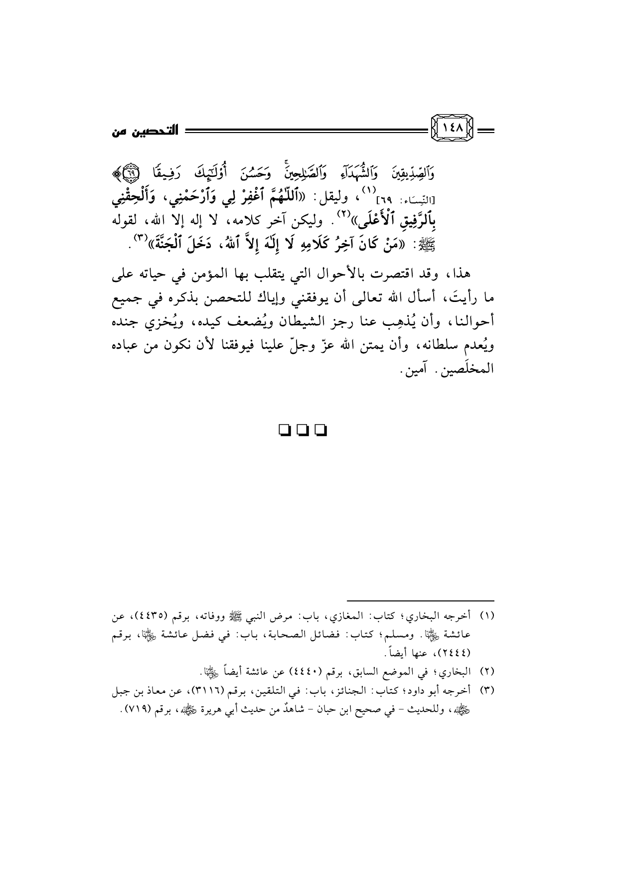 وَالصِّدِّيقِينَ وَالشُّهَدَاءِ وَالصَّالِحِينَ وَحَسُنَ أُولَئِكَ رَفِيقًا *} (¬1) ، وليقل: اللهُمَّ اغْفِرْ لِي وَارْحَمْنِي، وَأَلْحِقْنِي بِالرَّفِيقِ الأَْعْلَى (¬2) . وليكن آخر كلامه، لا إله إلا الله، لقوله صلى الله عليه وسلم: مَنْ كَانَ آخِرُ كَلاَمِهِ لاَ إِلَهَ إِلاَّ اللهُ، دَخَلَ الْجَنَّةَ (¬3) .