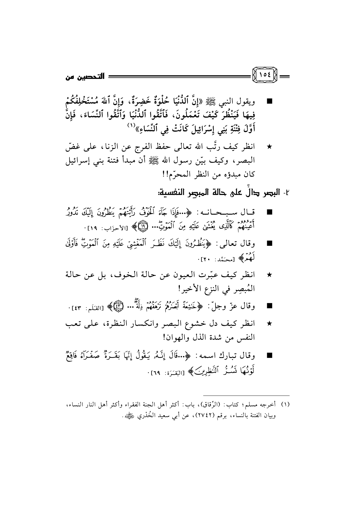 * ... انظر كيف رتَّب الله تعالى حفظ الفرج عن الزنا، على غضّ البصر، وكيف بيّن رسول الله صلى الله عليه وسلم أن مبدأ فتنة بني إسرائيل كان مبدؤه من النظر المحرّم!!