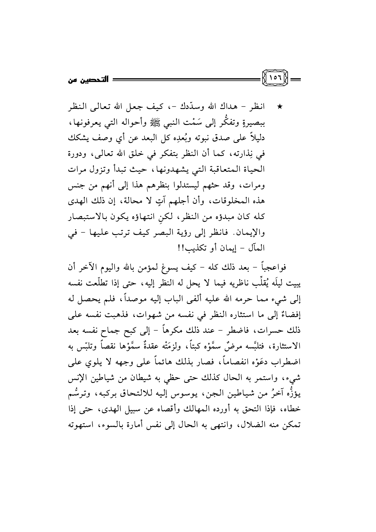 فواعجباً - بعد ذلك كله - كيف يسوغ لمؤمن بالله واليوم الآخر أن يبيت ليلَه يُقلِّب ناظريه فيما لا يحل له النظر إليه، حتى إذا تطلّعت نفسه إلى شيء مما حرمه الله عليه ألفى الباب إليه موصداً، فلم يحصل له إفضاءٌ إلى ما استثاره النظر في نفسه من شهوات، فذهبت نفسه على ذلك حسرات، فاضطر - عند ذلك مكرهاً - إلى كبح جماح نفسه بعد الاستثارة، فتلبَّسه مرضٌ سمَّوْه كبتاً، ولزمَتْه عقدةٌ سمَّوْها نقصاً وتلبّس به اضطراب دعَوْه انفصاماً، فصار بذلك هائماً على وجهه لا يلوي على شيء، واستمر به الحال كذلك حتى حظي به شيطان من شياطين الإنس يؤزُّه آخرُ من شياطين الجن، يوسوس إليه للالتحاق بركبه، وترسُّم خطاه، فإذا التحق به أورده المهالك وأقصاه عن سبيل الهدى، حتى إذا تمكن منه الضلال، وانتهى به الحال إلى نفس أمارة بالسوء، استهوته