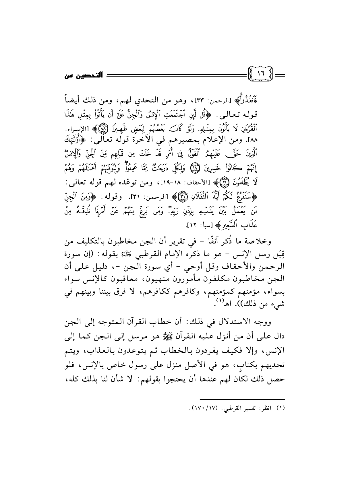 وخلاصة ما ذُكر آنفًا - في تقرير أن الجن مخاطبون بالتكليف من قِبَل رسل الإنس - هو ما ذكره الإمام القرطبي رحمه الله بقوله: (إن سورة الرحمن والأحقاف وقل أوحي - أي سورة الجن -، دليل على أن الجن مخاطبون مكلفون مأمورون منهيون، معاقبون كالإنس سواء بسواء، مؤمنهم كمؤمنهم، وكافرهم ككافرهم، لا فرق بيننا وبينهم في شيء من ذلك)) . اهـ (¬1) .