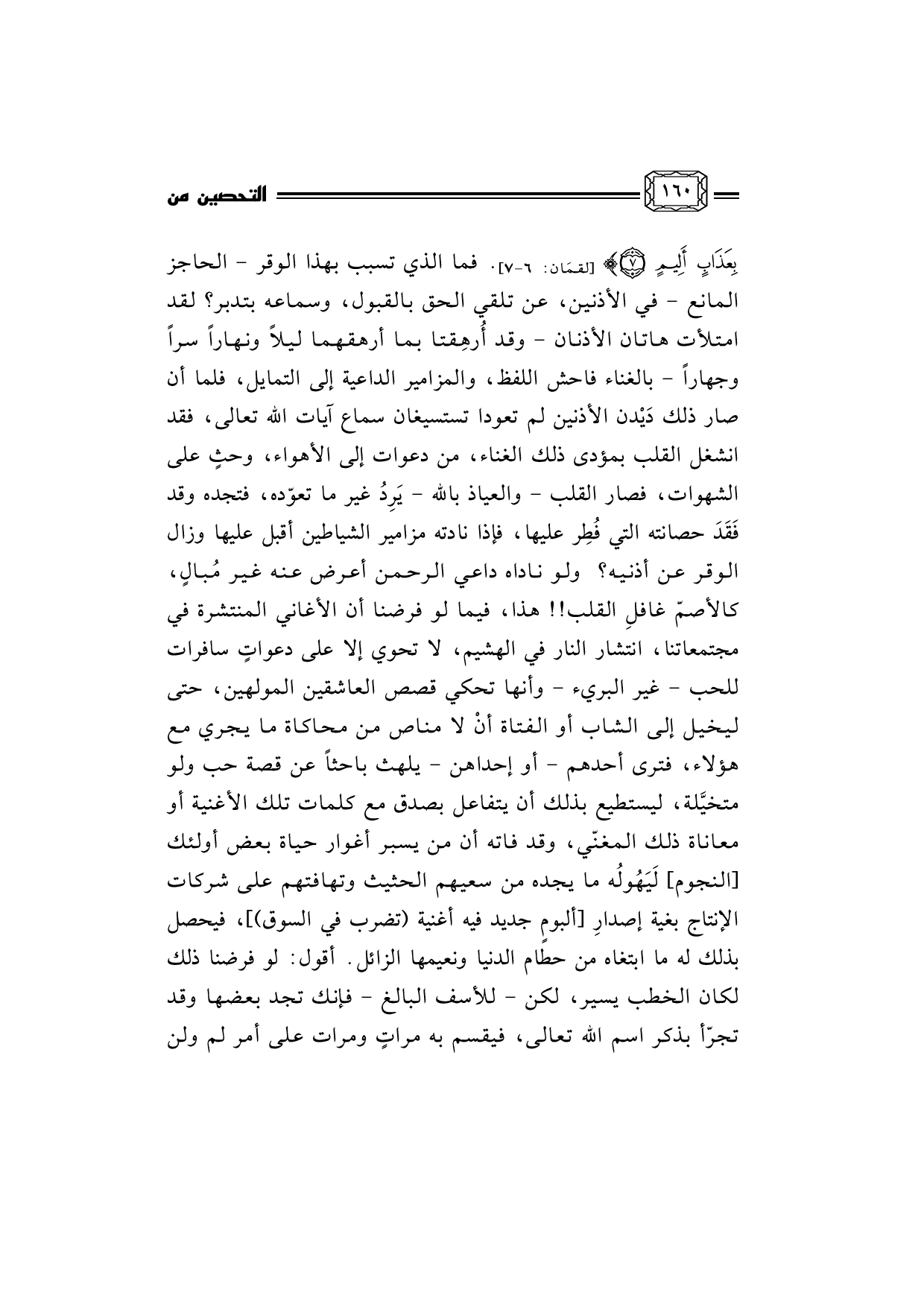 فما الذي تسبب بهذا الوقر - الحاجز المانع - في الأذنين، عن تلقي الحق بالقبول، وسماعه بتدبر؟ لقد امتلأت هاتان الأذنان - وقد أُرهِقتا بما أرهقهما ليلاً ونهاراً سراً وجهاراً - بالغناء فاحش اللفظ، والمزامير الداعية إلى التمايل، فلما أن صار ذلك دَيْدن الأذنين لم تعودا تستسيغان سماع آيات الله تعالى، فقد انشغل القلب بمؤدى ذلك الغناء، من دعوات إلى الأهواء، وحثٍ على الشهوات، فصار القلب - والعياذ بالله - يَرِدُ غير ما تعوّده، فتجده وقد فَقَدَ حصانته التي فُطِر عليها، فإذا نادته مزامير الشياطين أقبل عليها وزال الوقر عن أذنيه؟ ولو ناداه داعي الرحمن أعرض عنه غير مُبالٍ، كالأصمّ غافلِ القلب!! هذا، فيما لو فرضنا أن الأغاني المنتشرة في مجتمعاتنا، انتشار النار في الهشيم، لا تحوي إلا على دعواتٍ سافرات للحب - غير البريء - وأنها تحكي قصص العاشقين المولهين، حتى ليخيل إلى الشاب أو الفتاة أنْ لا مناص من محاكاة ما يجري مع هؤلاء، فترى أحدهم - أو إحداهن - يلهث باحثاً عن قصة حب ولو متخيَّلة، ليستطيع بذلك أن يتفاعل بصدق مع كلمات تلك الأغنية أو معاناة ذلك المغنّي، وقد فاته أن من يسبر أغوار حياة بعض أولئك [النجوم] لَيَهُولُه ما يجده من سعيهم الحثيث وتهافتهم على شركات الإنتاج بغية إصدارِ [ألبومٍ جديد فيه أغنية (تضرب في السوق) ، فيحصل بذلك له ما ابتغاه من حطام الدنيا ونعيمها الزائل.