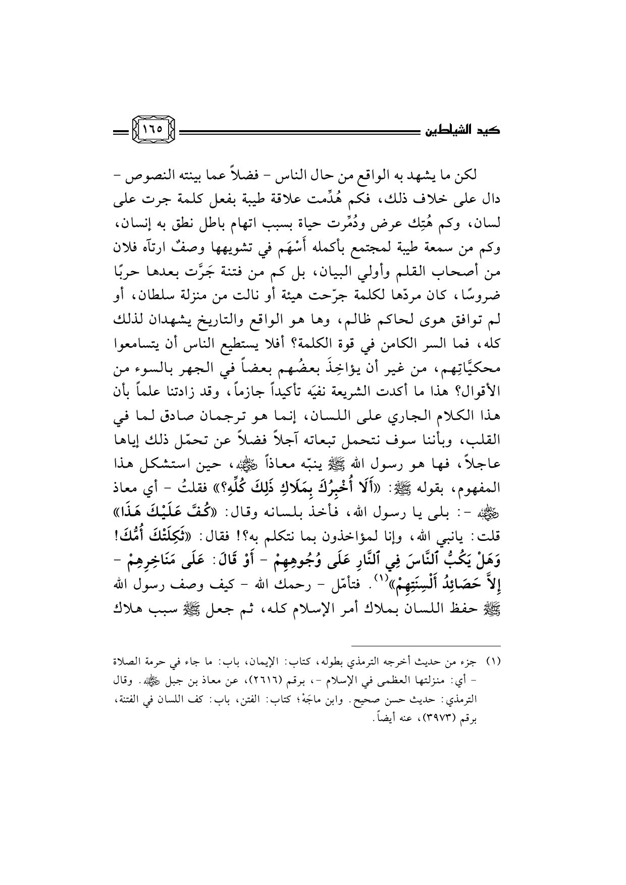 (¬1) جزء من حديث أخرجه الترمذي بطوله، كتاب: الإيمان، باب: ما جاء في حرمة الصلاة - أي: منزلتها العظمى في الإسلام -، برقم (2616) ، عن معاذ بن جبل رضي الله عنه. وقال الترمذي: حديث حسن صحيح. وابن ماجَهْ؛ كتاب: الفتن، باب: كف اللسان في الفتنة، برقم (3973) ، عنه أيضاً.