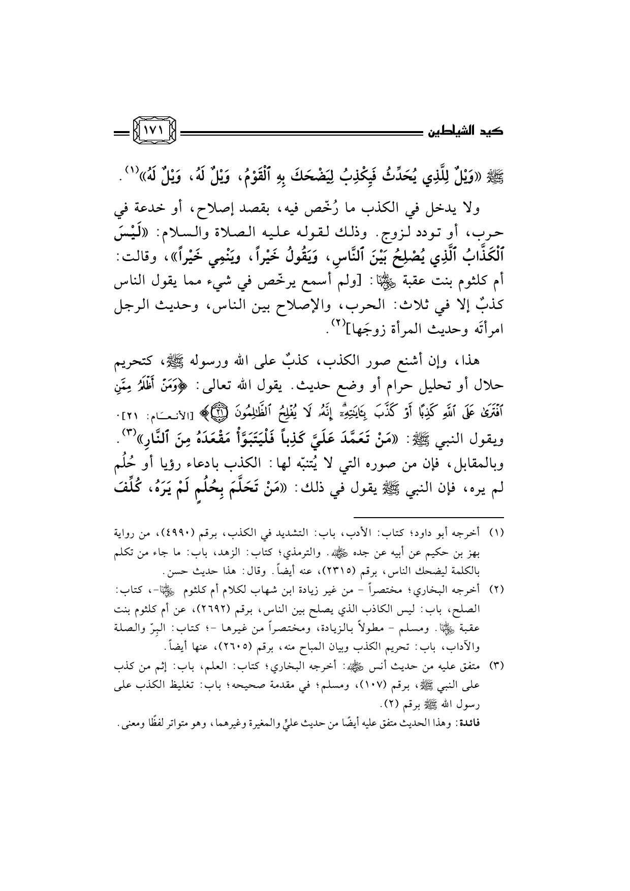 صلى الله عليه وسلم وَيْلٌ لِلَّذِي يُحَدِّثُ فَيِكْذِبُ لِيَضْحَكَ بِهِ الْقَوْمُ، وَيْلٌ لَهُ، وَيْلٌ لَهُ (¬1) .