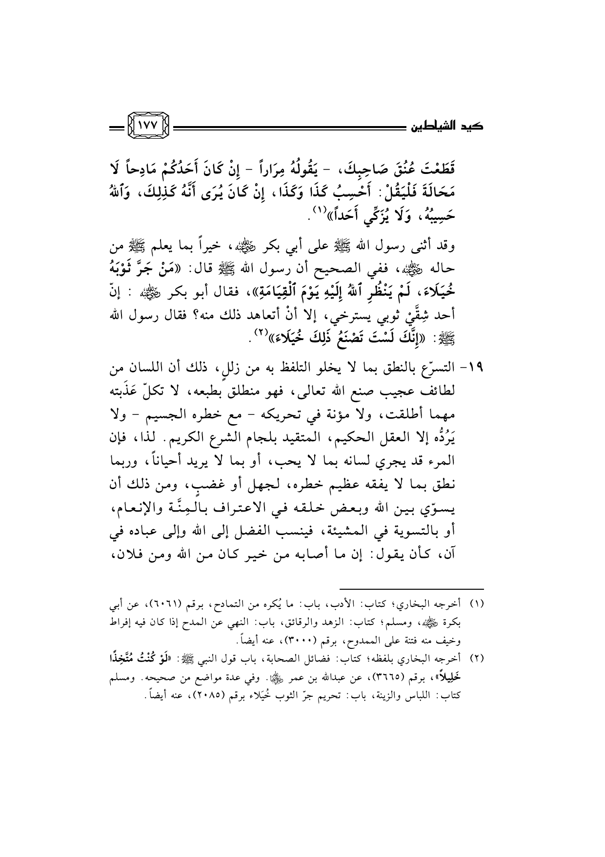 (¬2) أخرجه البخاري بلفظه؛ كتاب: فضائل الصحابة، باب قول النبي صلى الله عليه وسلم: «لَوْ كُنْتُ مُتَّخِذًا خَلِيلاً» ، برقم (3665) ، عن عبد الله بن عمر رضي الله عنهما. وفي عدة مواضع من صحيحه. ومسلم كتاب: اللباس والزينة، باب: تحريم جرّ الثوب خُيَلاء برقم (2085) ، عنه أيضاً.