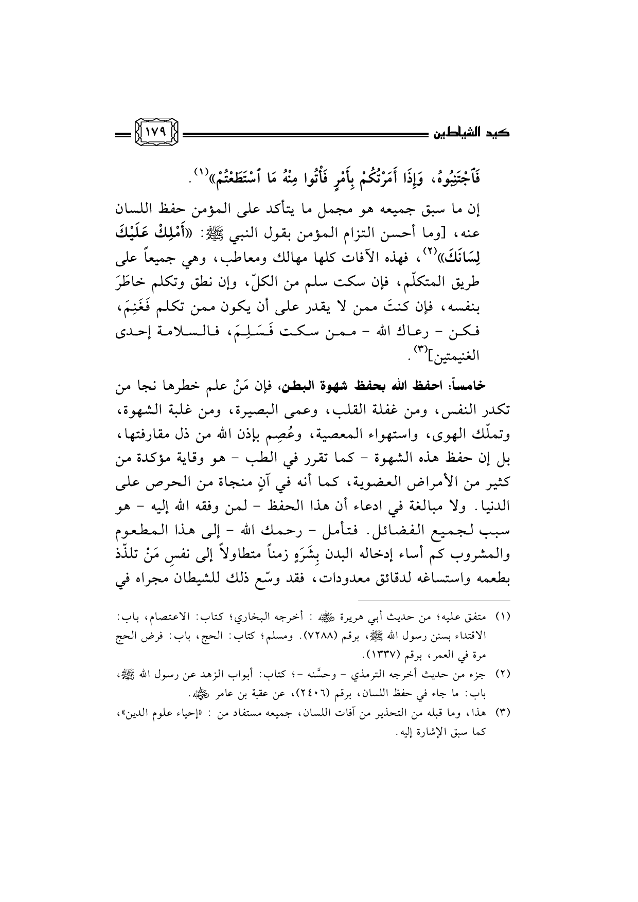 (¬3) هذا، وما قبله من التحذير من آفات اللسان، جميعه مستفاد من: «إحياء علوم الدين» ، كما سبق الإشارة إليه.