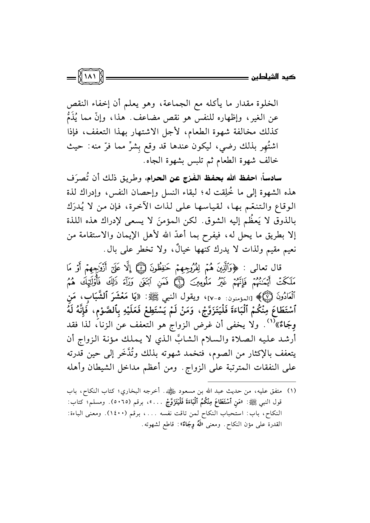 قال تعالى: {وَالَّذِينَ هُمْ لِفُرُوجِهِمْ حَافِظُونَ *إِلاَّ عَلَى أَزْوَاجِهِمْ أَوْ مَا مَلَكَتْ أَيْمَانُهُمْ فَإِنَّهُمْ غَيْرُ مَلُومِينَ *فَمَنِ ابْتَغَى وَرَاءَ ذَلِكَ فَأُولَئِكَ هُمُ الْعَادُونَ *} [المؤمنون: 5-7] ، ويقول النبي صلى الله عليه وسلم: يَا مَعْشَرَ الشَّبَابِ، مَنِ اسْتَطَاعَ مِنْكُمْ الْبَاءَةَ فَلْيَتَزَوَّجْ، وَمَنْ لَمْ يَسْتَطِعْ فَعَلَيْهِ بِالصَّوْمِ، فَإِنَّهُ لَهُ وِجَاءٌ (¬1) . ولا يخفى أن غرض الزواج هو التعفف عن الزنا، لذا فقد أرشد عليه الصلاة والسلام الشابَّ الذي لا يملك مؤنة الزواج أن يتعفف بالإكثار من الصوم، فتخمد شهوته بذلك وتُدَّخَر إلى حين قدرته على النفقات المترتبة على الزواج. ومن أعظم مداخل الشيطان وأهله