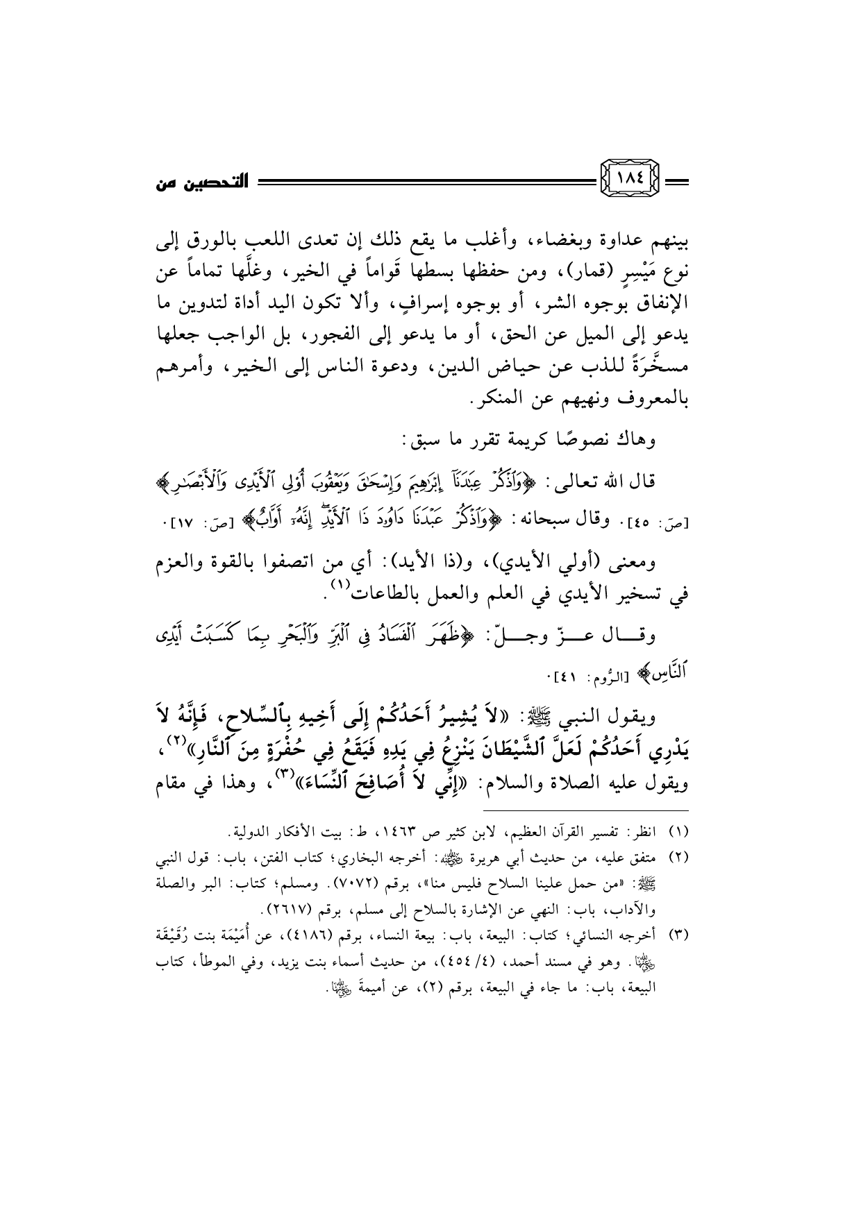 ويقول النبي صلى الله عليه وسلم: لاَ يُشِيرُ أَحَدُكُمْ إِلَى أَخِيهِ بِالسِّلاحِ، فَإِنَّهُ لاَ يَدْرِي أَحَدُكُمْ لَعَلَّ الشَّيْطَانَ يَنْزِعُ فِي يَدِهِ فَيَقَعُ فِي حُفْرَةٍ مِنَ النَّارِ (¬2) ، ويقول عليه الصلاة والسلام: إِنِّي لاَ أُصَافِحَ النِّسَاءَ (¬3) ، وهذا في مقام
