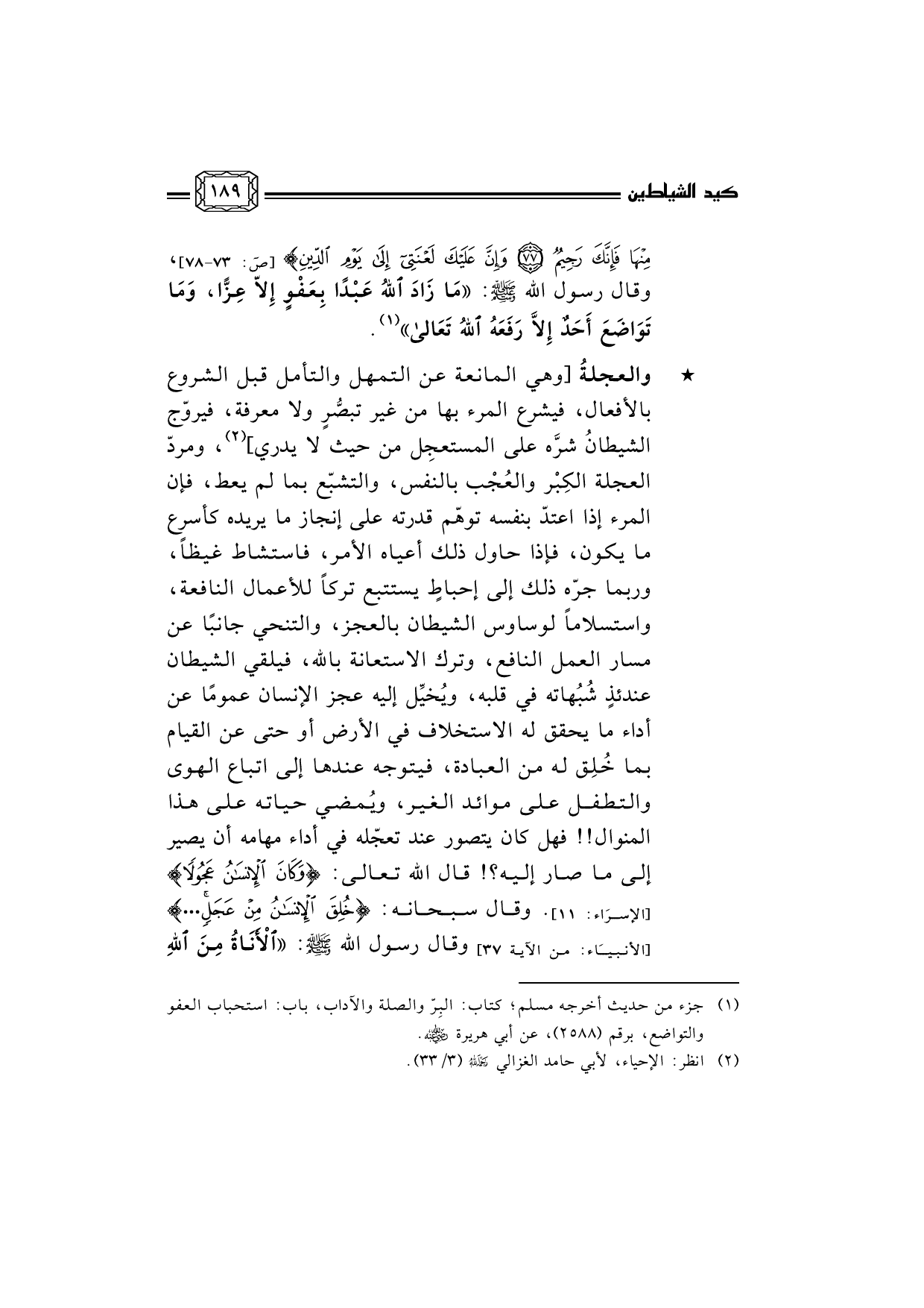 * ... والعجلةُ [وهي المانعة عن التمهل والتأمل قبل الشروع بالأفعال، فيشرع المرء بها من غير تبصُّرٍ ولا معرفة، فيروّج الشيطانُ شرَّه على المستعجِل من حيث لا يدري] (¬2) ، ومردّ العجلة الكِبْر والعُجْب بالنفس، والتشبّع بما لم يعط، فإن المرء إذا اعتدّ بنفسه توهّم قدرته على إنجاز ما يريده كأسرع ما يكون، فإذا حاول ذلك أعياه الأمر، فاستشاط غيظاً، وربما جرّه ذلك إلى إحباطٍ يستتبع تركاً للأعمال النافعة، واستسلاماً لوساوس الشيطان بالعجز، والتنحي جانبًا عن مسار العمل النافع، وترك الاستعانة بالله، فيلقي الشيطان عندئذٍ شُبُهاته في قلبه، ويُخيِّل إليه عجز الإنسان عمومًا عن أداء ما يحقق له الاستخلاف في الأرض أو حتى عن القيام بما خُلِق له من العبادة، فيتوجه عندها إلى اتباع الهوى والتطفل على موائد الغير، ويُمضي حياته على هذا المنوال!! فهل كان يتصور عند تعجّله في أداء مهامه أن يصير إلى ما صار إليه؟! قال الله تعالى: [الإسرَاء: 11] {وَكَانَ الإِنْسَانُ عَجُولاً} . وقال سبحانه: [الأنبيَاء: من الآية 37] {خُلِقَ الإِنْسَانُ مِنْ عَجَلٍ ... } وقال رسول الله صلى الله عليه وسلم: الأَْنَاةُ مِنَ اللهِ