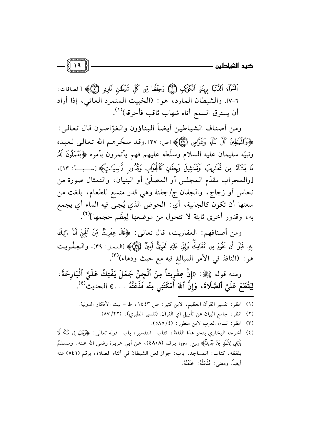 ومن أصناف الشياطين أيضاً البناؤون والغوّاصون قال تعالى: {وَالشَّيْاطِينَ كُلَّ بَنَّاءٍ وَغَوَّاصٍ *} [ص: 37] . وقد سخّرهم الله تعالى لعبده ونبيّه سليمان عليه السلام وسلّطه عليهم فهم يأتمرون بأمره {يَعْمَلُونَ لَهُ مَا يَشَاءُ مِنْ مَحَارِيبَ وَتَمَاثِيلَ وَجِفَانٍ كَالْجَوَابِ وَقُدُورٍ رَاسِيَاتٍ} [سبأ: 13] ، [والمحراب مقدّم المجلس أو المصلّى أو البنيان، والتمثال صورة من نحاس أو زجاج، والجفان ج/جفنة وهي قدر متسع للطعام، بلغت من سعتها أن تكون كالجابية، أي: الحوض الذي يُجبى فيه الماء أي يجمع به، وقدور أخرى ثابتة لا تتحول من موضعها لِعِظَم حجمها] (¬2) .