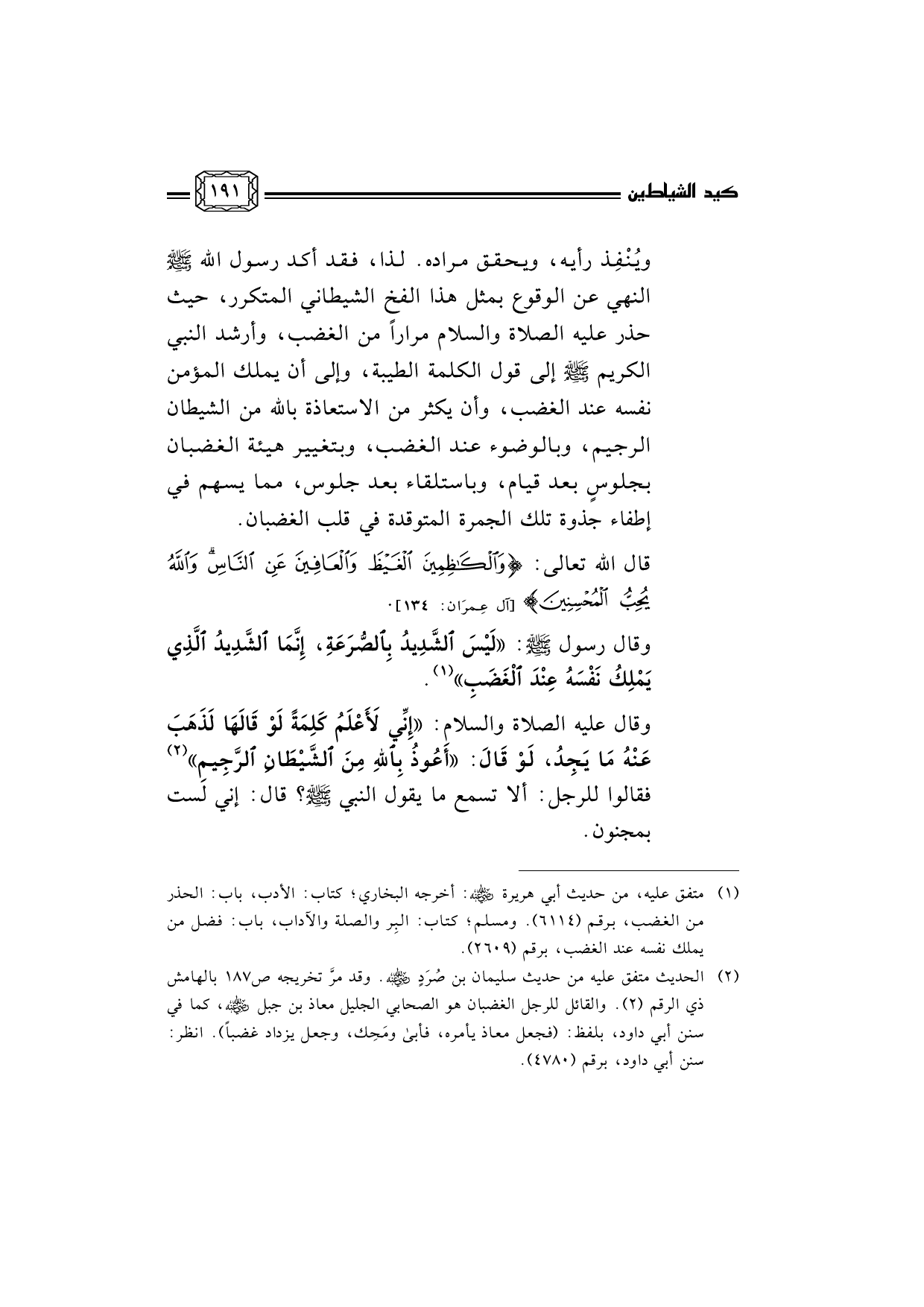 ويُنْفِذ رأيه، ويحقق مراده. لذا، فقد أكد رسول الله صلى الله عليه وسلم النهي عن الوقوع بمثل هذا الفخ الشيطاني المتكرر، حيث حذر عليه الصلاة والسلام مراراً من الغضب، وأرشد النبي الكريم صلى الله عليه وسلم إلى قول الكلمة الطيبة، وإلى أن يملك المؤمن نفسه عند الغضب، وأن يكثر من الاستعاذة بالله من الشيطان الرجيم، وبالوضوء عند الغضب، وبتغيير هيئة الغضبان بجلوسٍ بعد قيام، وباستلقاء بعد جلوس، مما يسهم في إطفاء جذوة تلك الجمرة المتوقدة في قلب الغضبان.