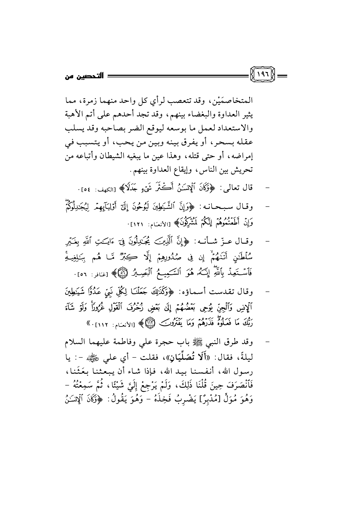 - ... وقد طرق النبي صلى الله عليه وسلم باب حجرة علي وفاطمة عليهما السلام ليلةً، فقال: أَلاَ تُصَلِّيَانِ، فقلت - أي علي رضي الله عنه -: يا رسول الله، أنفسنا بيد الله، فإذا شاء أن يبعثنا بعَثَنا، فَانْصَرَفَ حِينَ قُلْنَا ذَلِكَ، وَلَمْ يَرْجِعْ إِلَيَّ شَيْئًا، ثُمَّ سَمِعْتُهُ - وَهُوَ مُوَلٍّ [مُدْبِرٌ] يَضْرِبُ فَخِذَهُ - وَهُوَ يَقُولُ: {وَكَانَ الإِنْسَانُ