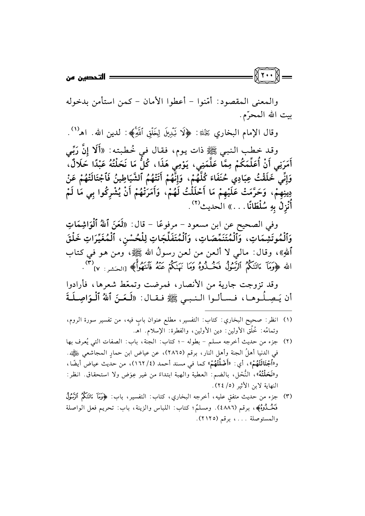 وفي الصحيح عن ابن مسعود - مرفوعًا - قال: لَعَنَ اللهُ الْوَاشِمَاتِ وَالْمُوتَشِمَاتِ، وَالْمُتَنَمِّصَاتِ، وَالْمُتَفَلِّجَاتِ لِلْحُسْنِ، الْمُغَيِّرَاتِ خَلْقَ اللهِ، وقال: مالي لا ألعن من لعن رسولُ الله صلى الله عليه وسلم، ومن هو في كتاب الله {وَمَا آتَاكُمُ الرَّسُولُ فَخُذُوهُ وَمَا نَهَاكُمْ عَنْهُ فَانْتَهُوا} [الحَشر: 7] (¬3) .
