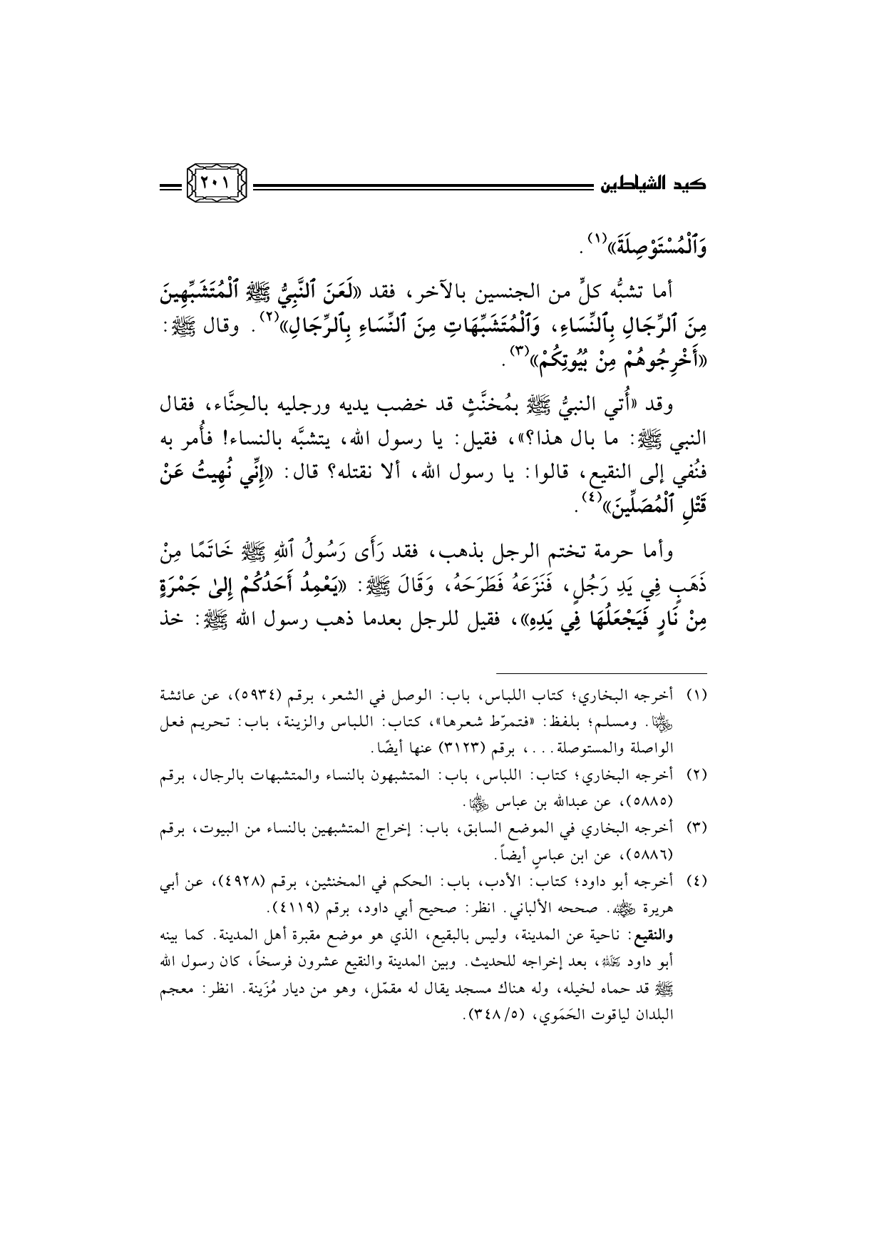 (¬4) أخرجه أبو داود؛ كتاب: الأدب، باب: الحكم في المخنثين، برقم (4928) ، عن أبي هريرة رضي الله عنه. صححه الألباني. انظر: صحيح أبي داود، برقم (4119) . ... والنقيع: ناحية عن المدينة، وليس بالبقيع، الذي هو موضع مقبرة أهل المدينة. كما بينه أبو داود رحمه الله، بعد إخراجه للحديث. وبين المدينة والنقيع عشرون فرسخاً، كان رسول الله صلى الله عليه وسلم قد حماه لخيله، وله هناك مسجد يقال له مقمّل، وهو من ديار مُزَينة. انظر: معجم البلدان لياقوت الحَمَوي، (5/348) .