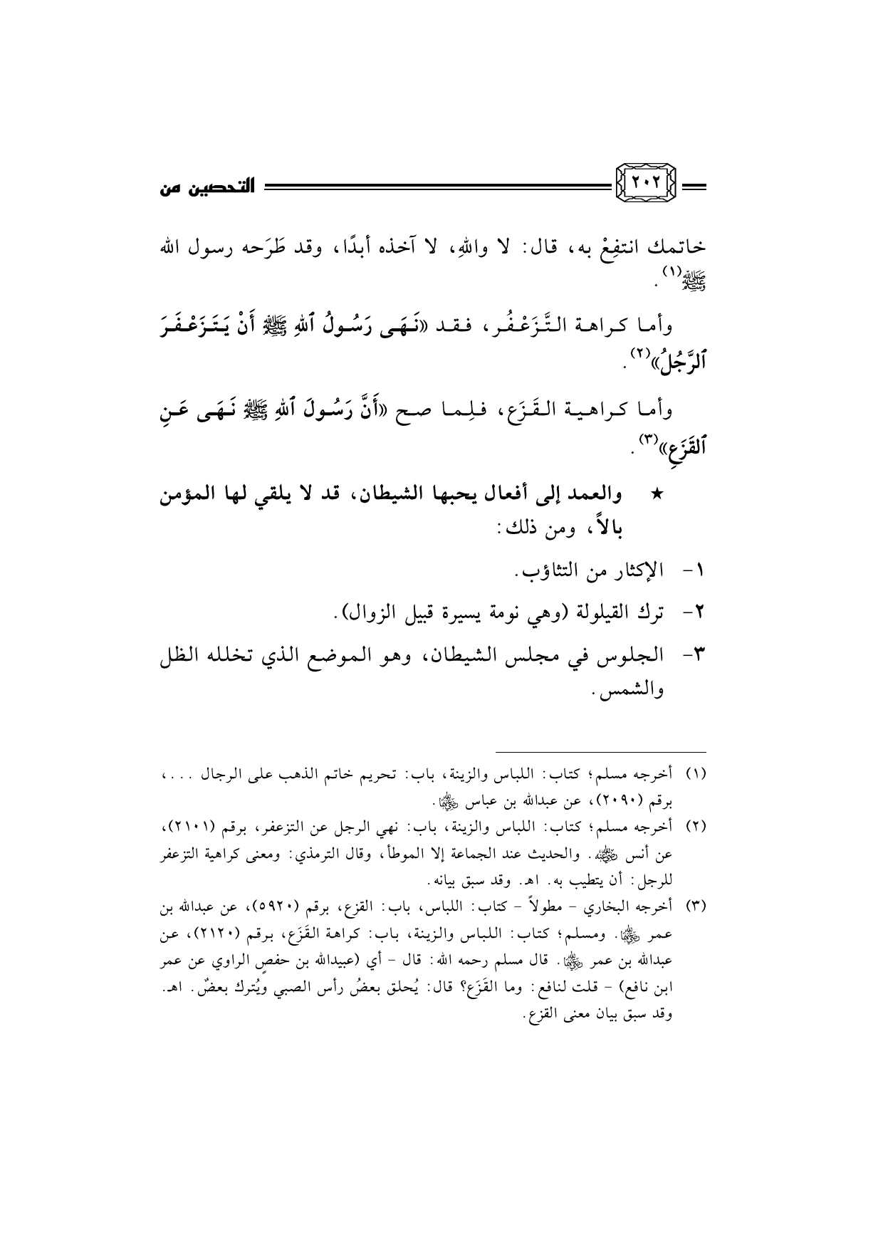 (¬2) أخرجه مسلم؛ كتاب: اللباس والزينة، باب: نهي الرجل عن التزعفر، برقم (2101) ، عن أنس رضي الله عنه. والحديث عند الجماعة إلا الموطأ، وقال الترمذي: ومعنى كراهية التزعفر للرجل: أن يتطيب به. اهـ. وقد سبق بيانه.