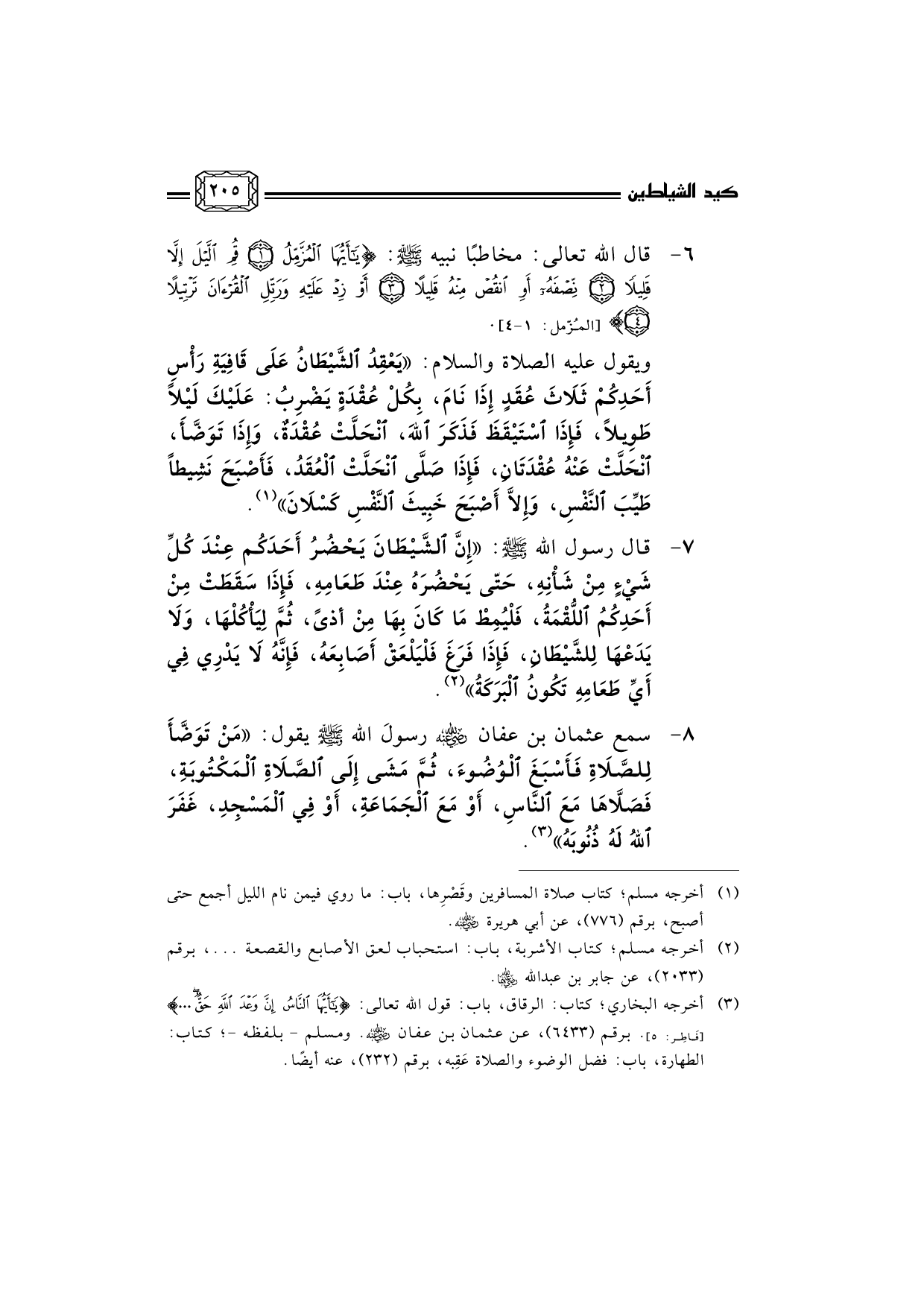 ويقول عليه الصلاة والسلام: يَعْقِدُ الشَّيْطَانُ عَلَى قَافِيَةِ رَأْسِ أَحَدِكُمْ ثَلاَثَ عُقَدٍ إِذَا نَامَ، بِكُلْ عُقْدَةٍ يَضْرِبُ: عَلَيْكَ لَيْلاً طَوِيلاً، فَإِذَا اسْتَيْقَظَ فَذَكَرَ اللهَ، انْحَلَّتْ عُقْدَةٌ، وَإِذَا تَوَضَّأَ، انْحَلَّتْ عَنْهُ عُقْدَتَانِ، فَإِذَا صَلَّى انْحَلَّتْ الْعُقَدُ، فَأَصْبَحَ نَشِيطاً طَيِّبَ النَّفْسِ، وَإِلاَّ أَصْبَحَ خَبِيثَ النَّفْسِ كَسْلاَنَ (¬1) .