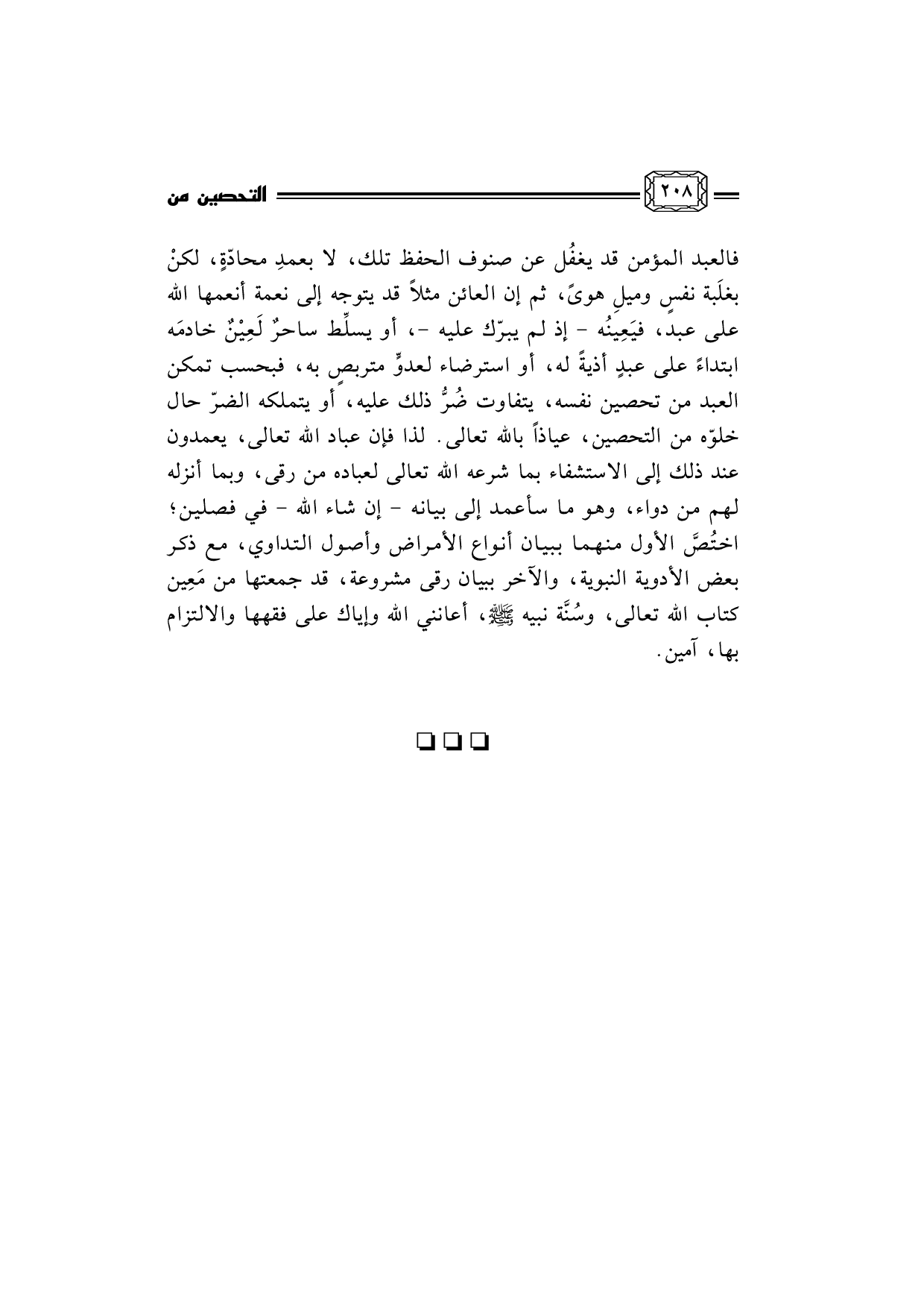 فالعبد المؤمن قد يغفُل عن صنوف الحفظ تلك، لا بعمدِ محادّةٍ، لكنْ بغلَبة نفسٍ وميلِ هوىً، ثم إن العائن مثلاً قد يتوجه إلى نعمة أنعمها الله على عبد، فيَعِينُه - إذ لم يبرّك عليه -، أو يسلِّط ساحرٌ لَعِيْنٌ خادمَه ابتداءً على عبدٍ أذيةً له، أو استرضاء لعدوٍّ متربصٍ به، فبحسب تمكن العبد من تحصين نفسه، يتفاوت ضُرُّ ذلك عليه، أو يتملكه الضرّ حال خلوّه من التحصين، عياذاً بالله تعالى. لذا فإن عباد الله تعالى، يعمدون عند ذلك إلى الاستشفاء بما شرعه الله تعالى لعباده من رقى، وبما أنزله لهم من دواء، وهو ما سأعمد إلى بيانه - إن شاء الله - في فصلين؛ اختُصَّ الأول منهما ببيان أنواع الأمراض وأصول التداوي، مع ذكر بعض الأدوية النبوية، والآخر ببيان رقى مشروعة، قد جمعتها من مَعِين كتاب الله تعالى، وسُنَّة نبيه صلى الله عليه وسلم، أعانني الله وإياك على فقهها والالتزام بها، آمين.