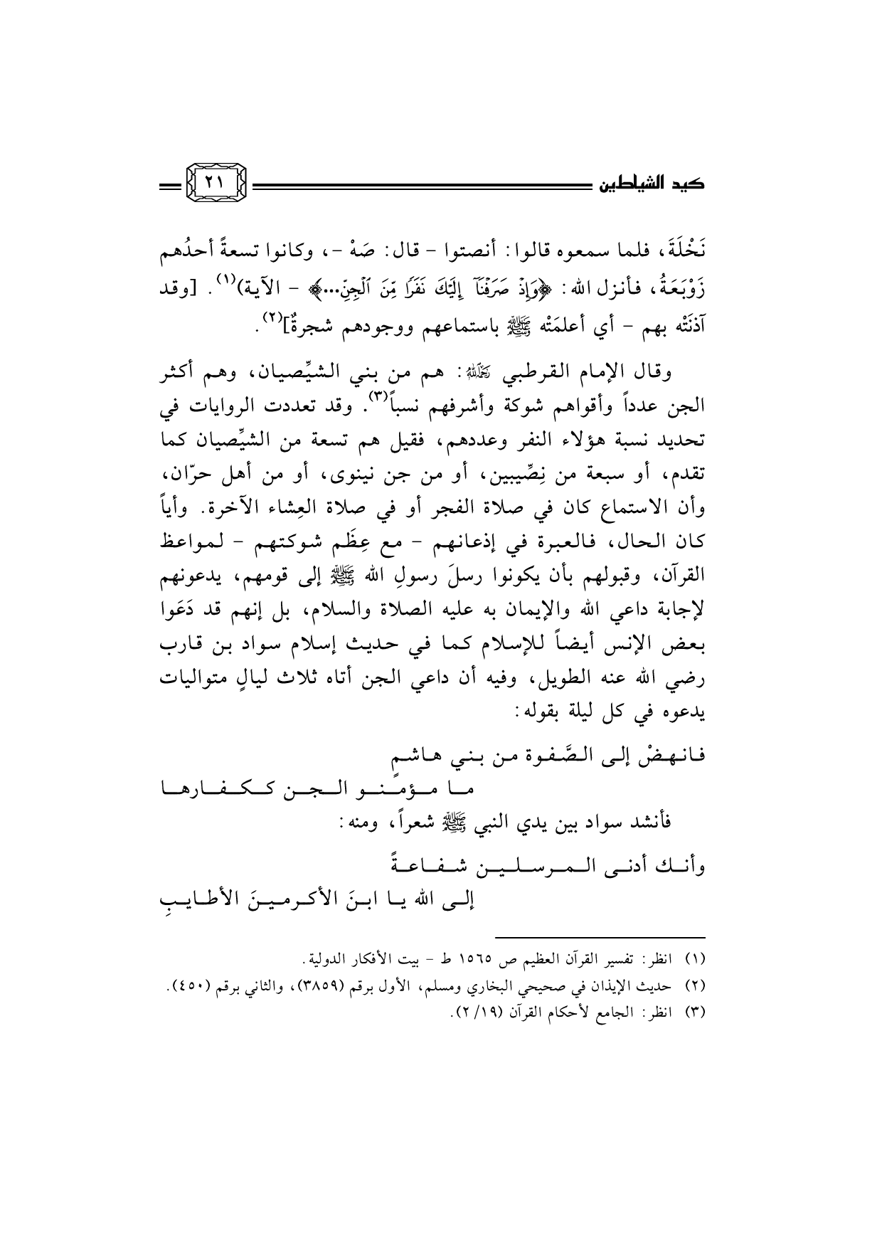 وقال الإمام القرطبي رحمه الله: هم من بني الشيِّصيان، وهم أكثر الجن عدداً وأقواهم شوكة وأشرفهم نسباً (¬3) . وقد تعددت الروايات في تحديد نسبة هؤلاء النفر وعددهم، فقيل هم تسعة من الشيِّصيان كما تقدم، أو سبعة من نِصِّيبين، أو من جن نينوى، أو من أهل حرّان، وأن الاستماع كان في صلاة الفجر أو في صلاة العِشاء الآخرة. وأياً كان الحال، فالعبرة في إذعانهم - مع عِظَم شوكتهم - لمواعظ القرآن، وقبولهم بأن يكونوا رسلَ رسولِ الله صلى الله عليه وسلم إلى قومهم، يدعونهم لإجابة داعي الله والإيمان به عليه الصلاة والسلام، بل إنهم قد دَعَوا بعض الإنس أيضاً للإسلام كما في حديث إسلام سواد بن قارب رضي الله عنه الطويل، وفيه أن داعي الجن أتاه ثلاث ليالٍ متواليات يدعوه في كل ليلة بقوله: