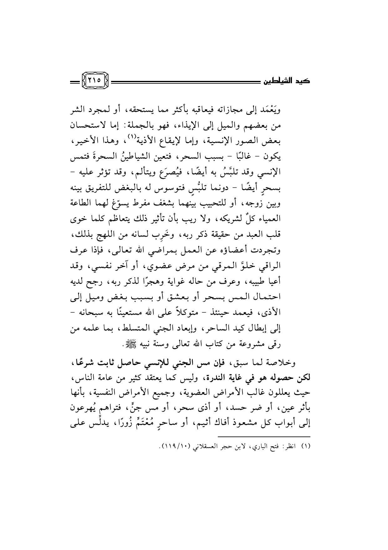 ويَعْمَد إلى مجازاته فيعاقبه بأكثر مما يستحقه، أو لمجرد الشر من بعضهم والميل إلى الإيذاء، فهو بالجملة: إما لاستحسان بعض الصور الإنسية، وإما لإيقاع الأذية (¬1) ، وهذا الأخير، يكون - غالبًا - بسبب السحر، فتعين الشياطينُ السحرةَ فتمس الإنسي وقد تلبَّسُ به أيضًا، فيُصرَع ويتألم، وقد تؤثر عليه - بسحرٍ أيضًا - دونما تلبُّسٍ فتوسوس له بالبغض للتفريق بينه وبين زوجه، أو للتحبيب بينهما بشغف مفرط يسوّغ لهما الطاعة العمياء كلٌ لشريكه، ولا ريب بأن تأثير ذلك يتعاظم كلما خوى قلب العبد من حقيقة ذكر ربه، وخَرِب لسانه من اللهج بذلك، وتجردت أعضاؤه عن العمل بمراضي الله تعالى، فإذا عرف الراقي خلوَّ المرقي من مرض عضوي، أو آخر نفسي، وقد أعيا طبيبه، وعرف من حاله غواية وهجرًا لذكر ربه، رجح لديه احتمال المس بسحر أو بعشق أو بسبب بغض وميل إلى الأذى، فيعمد حينئذ - متوكلاً على الله مستعينًا به سبحانه - إلى إبطال كيد الساحر، وإبعاد الجني المتسلط، بما علمه من رقى مشروعة من كتاب الله تعالى وسنة نبيه صلى الله عليه وسلم.