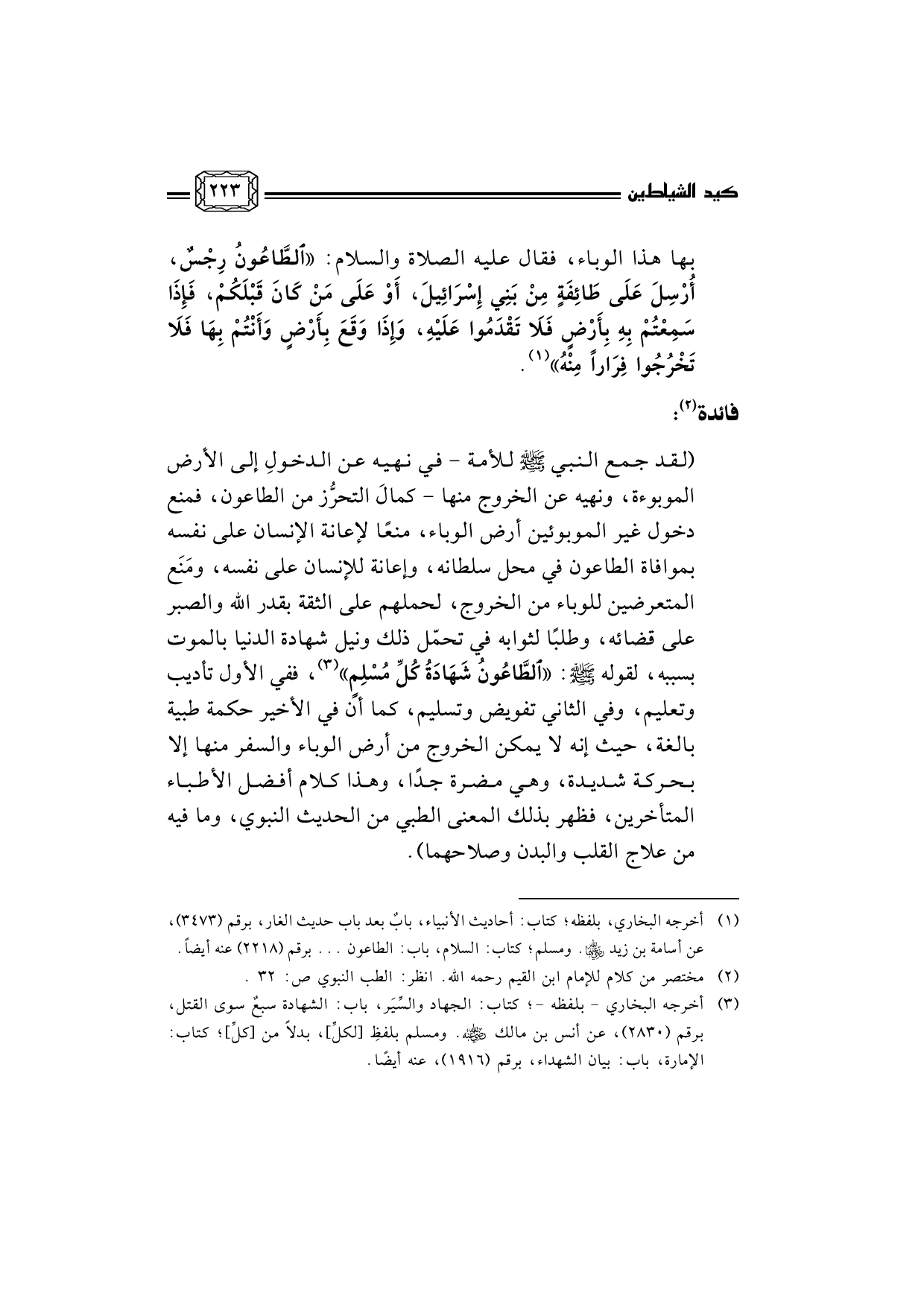 (لقد جمع النبي صلى الله عليه وسلم للأمة - في نهيه عن الدخولِ إلى الأرض الموبوءة، ونهيه عن الخروج منها - كمالَ التحرُّز من الطاعون، فمنع دخول غير الموبوئين أرض الوباء، منعًا لإعانة الإنسان على نفسه بموافاة الطاعون في محل سلطانه، وإعانة للإنسان على نفسه، ومَنَع المتعرضين للوباء من الخروج، لحملهم على الثقة بقدر الله والصبر على قضائه، وطلبًا لثوابه في تحمّل ذلك ونيل شهادة الدنيا بالموت بسببه، لقوله صلى الله عليه وسلم: الطَّاعُونُ شَهَادَةُ كُلِّ مُسْلِمٍ (¬3) ، ففي الأول تأديب وتعليم، وفي الثاني تفويض وتسليم، كما أن في الأخير حكمة طبية بالغة، حيث إنه لا يمكن الخروج من أرض الوباء والسفر منها إلا بحركة شديدة، وهي مضرة جدًا، وهذا كلام أفضل الأطباء المتأخرين، فظهر بذلك المعنى الطبي من الحديث النبوي، وما فيه من علاج القلب والبدن وصلاحهما) .