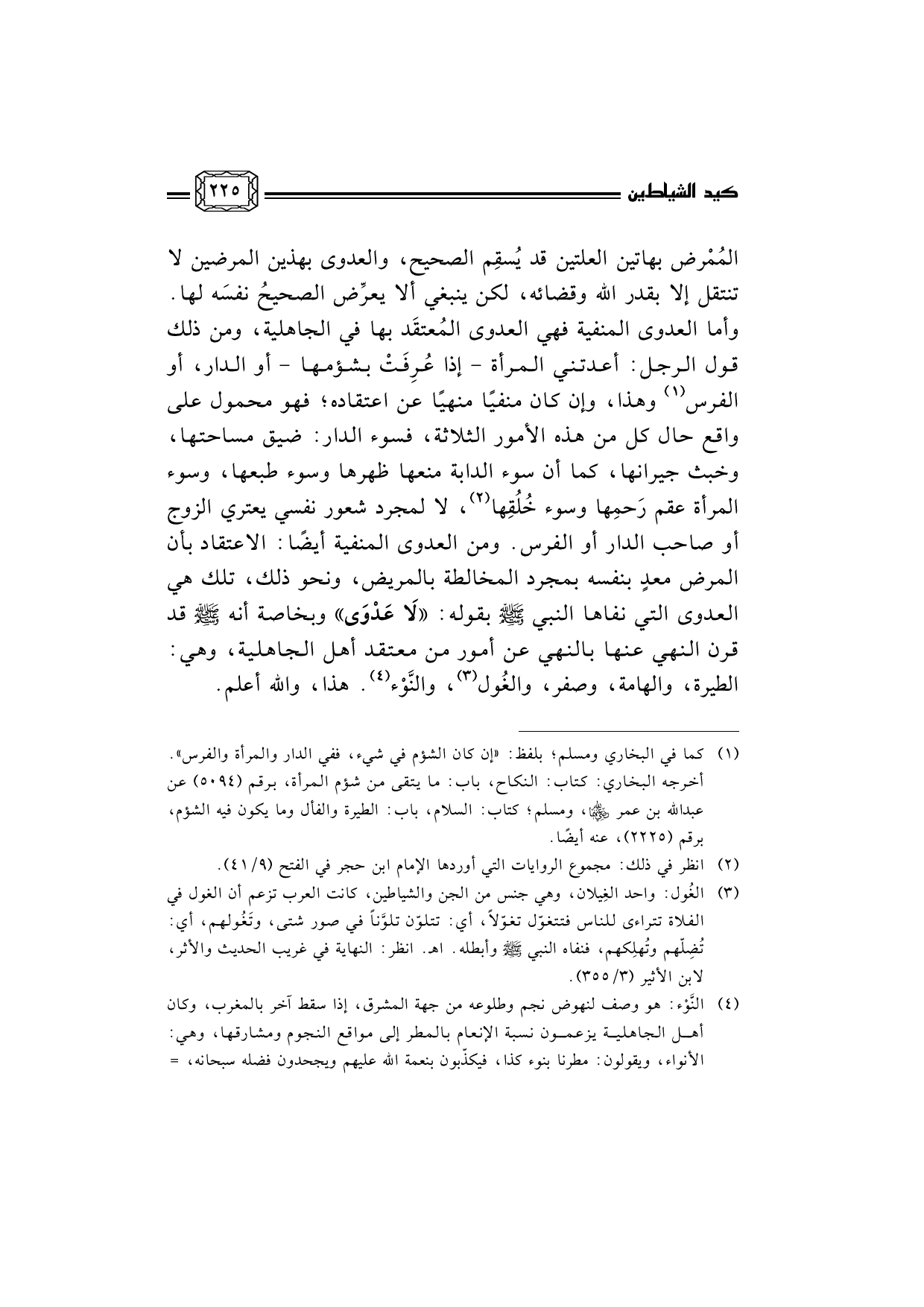 المُمْرض بهاتين العلتين قد يُسقِم الصحيح، والعدوى بهذين المرضين لا تنتقل إلا بقدر الله وقضائه، لكن ينبغي ألا يعرِّض الصحيحُ نفسَه لها. وأما العدوى المنفية فهي العدوى المُعتقَد بها في الجاهلية، ومن ذلك قول الرجل: أعدتني المرأة - إذا عُرِفَتْ بشؤمها - أو الدار، أو الفرس (¬1) وهذا، وإن كان منفيًا منهيًا عن اعتقاده؛ فهو محمول على واقع حال كل من هذه الأمور الثلاثة، فسوء الدار: ضيق مساحتها، وخبث جيرانها، كما أن سوء الدابة منعها ظهرها وسوء طبعها، وسوء المرأة عقم رَحمِها وسوء خُلُقِها (¬2) ، لا لمجرد شعور نفسي يعتري الزوج أو صاحب الدار أو الفرس. ومن العدوى المنفية أيضًا: الاعتقاد بأن المرض معدٍ بنفسه بمجرد المخالطة بالمريض، ونحو ذلك، تلك هي العدوى التي نفاها النبي صلى الله عليه وسلم بقوله: لاَ عَدْوَى وبخاصة أنه صلى الله عليه وسلم قد قرن النهي عنها بالنهي عن أمور من معتقد أهل الجاهلية، وهي: الطيرة، والهامة، وصفر، والغُول (¬3) ، والنَّوْء (¬4) . هذا، والله أعلم.