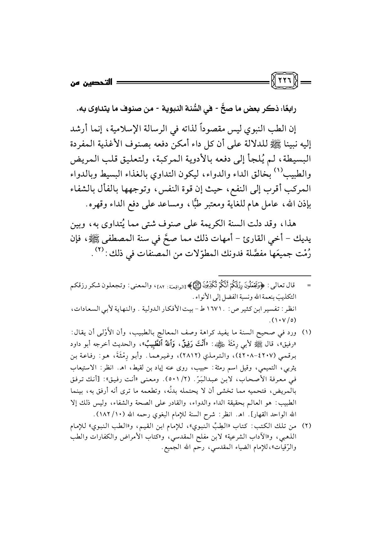 (¬2) من تلك الكتب: كتاب «الطِبِّ النبوي» ، للإمام ابن القيم، و «الطب النبوي» للإمام الذهبي، و «الآداب الشرعية» لابن مفلح المقدسي، و «كتاب الأمراض والكفارات والطب والرّقيات» ، للإمام الضياء المقدسي، رحم الله الجميع.