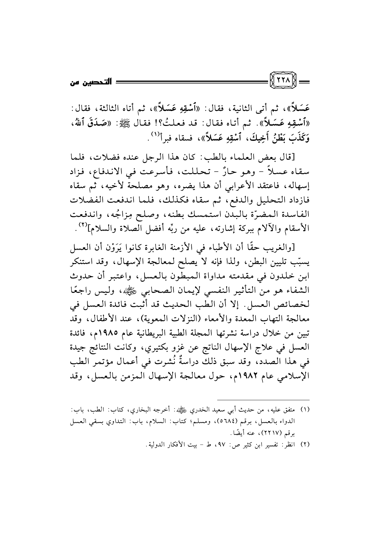 (¬1) متفق عليه، من حديث أبي سعيد الخدري رضي الله عنه: أخرجه البخاري، كتاب: الطب، باب: الدواء بالعسل، برقم (5684) ، ومسلم؛ كتاب: السلام، باب: التداوي بسقي العسل برقم (2217) ، عنه أيضًا.