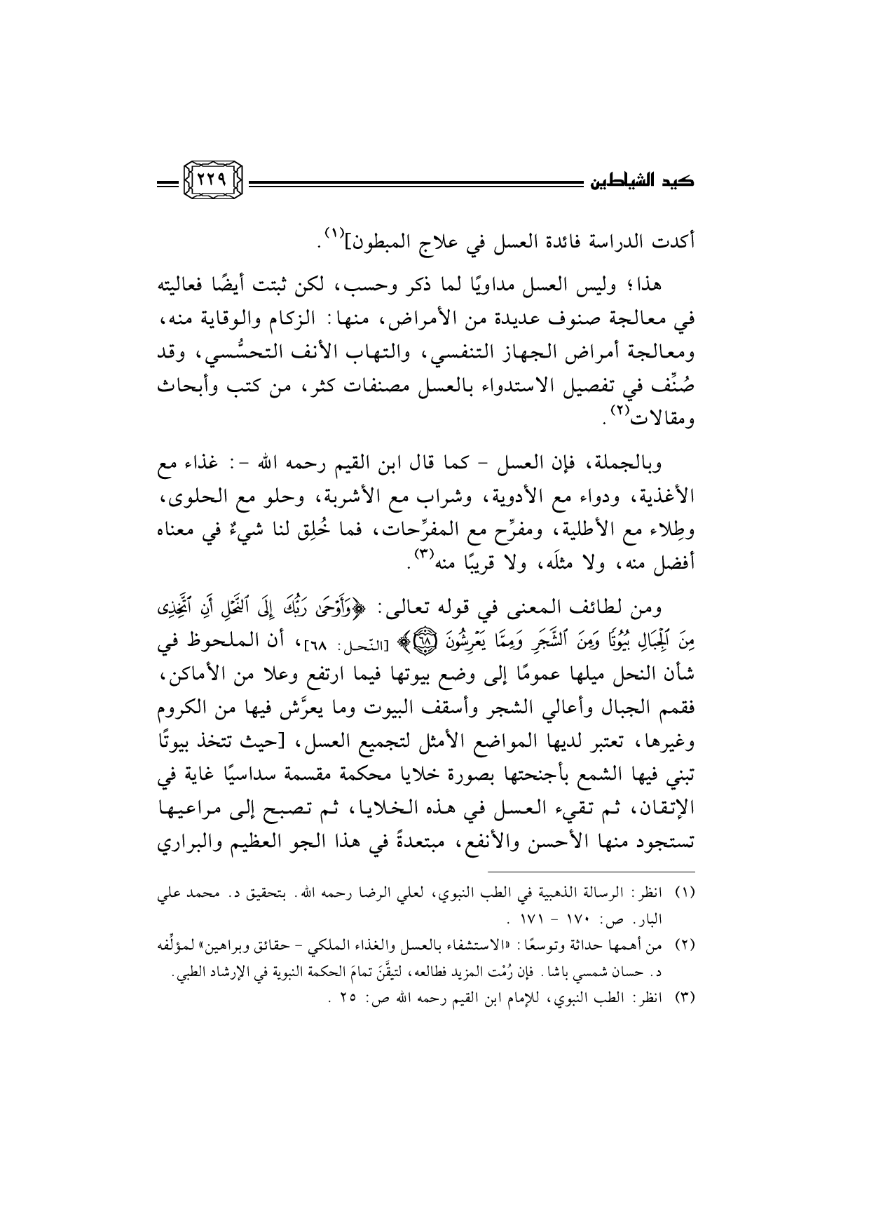 (¬2) من أهمها حداثة وتوسعًا: «الاستشفاء بالعسل والغذاء الملكي - حقائق وبراهين» لمؤلِّفه د. حسان شمسي باشا. فإن رُمْت المزيد فطالعه، لتيقَّنَ تمامَ الحكمة النبوية في الإرشاد الطبي.