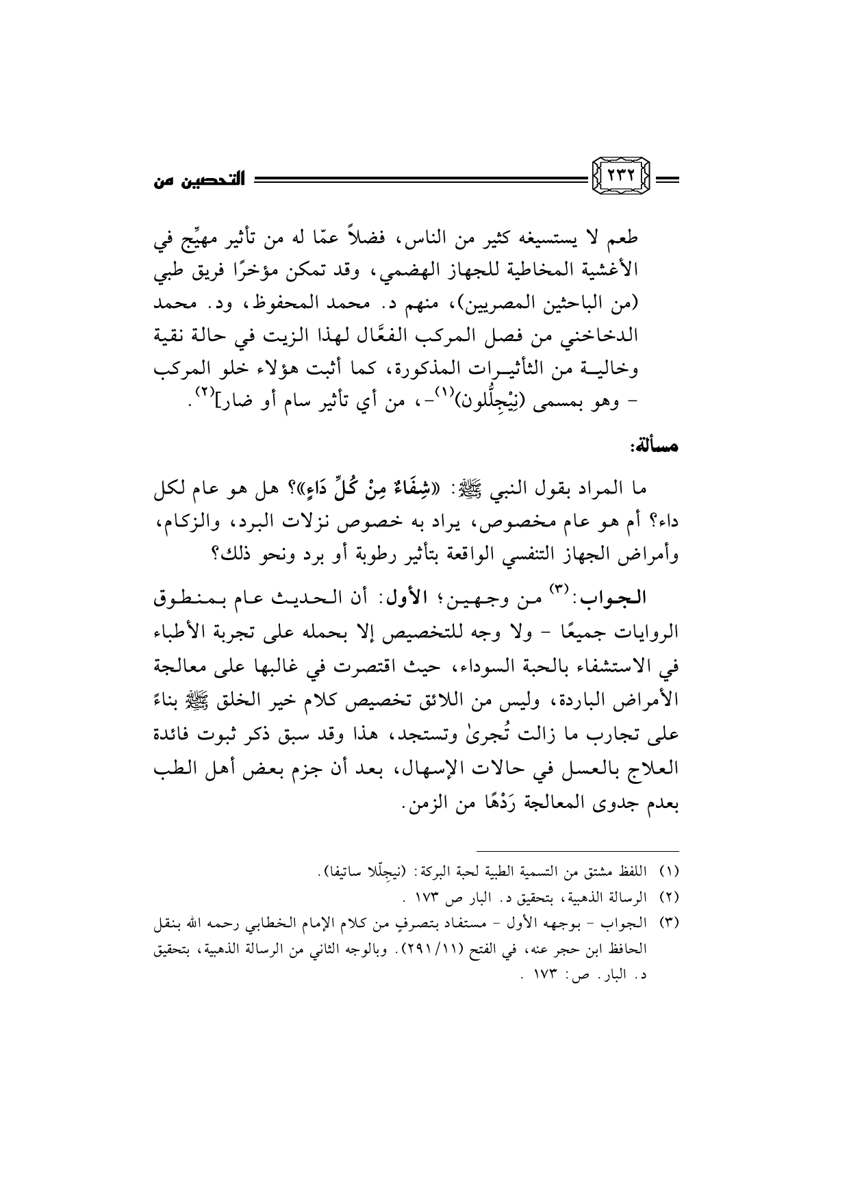 الجواب: (¬3) من وجهين؛ الأول: أن الحديث عام بمنطوق الروايات جميعًا - ولا وجه للتخصيص إلا بحمله على تجربة الأطباء في الاستشفاء بالحبة السوداء، حيث اقتصرت في غالبها على معالجة الأمراض الباردة، وليس من اللائق تخصيص كلام خير الخلق صلى الله عليه وسلم بناءً على تجارب ما زالت تُجرى وتستجد، هذا وقد سبق ذكر ثبوت فائدة العلاج بالعسل في حالات الإسهال، بعد أن جزم بعض أهل الطب بعدم جدوى المعالجة رَدْهًا من الزمن.