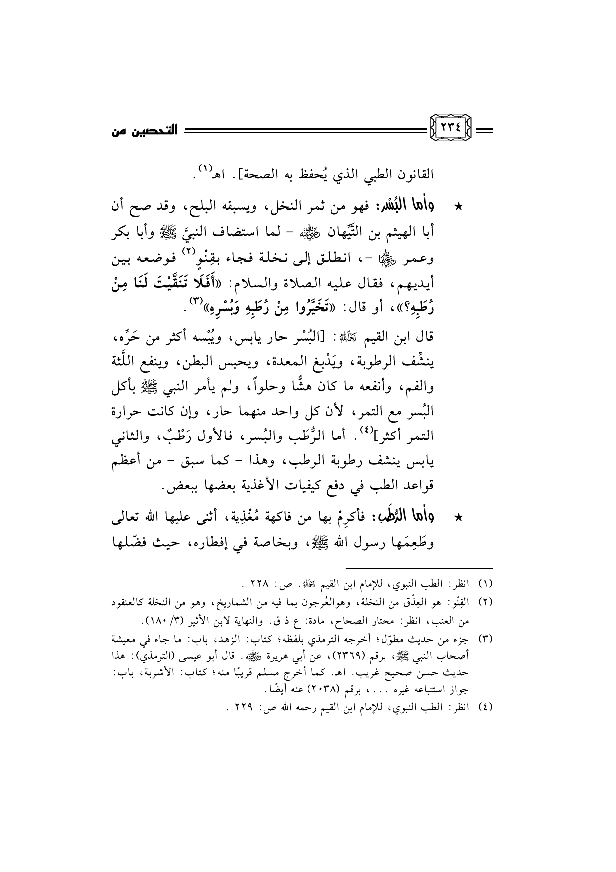 قال ابن القيم رحمه الله: [البُسْر حار يابس، ويُبْسه أكثر من حَرِّه، ينشِّف الرطوبة، ويَدْبغ المعدة، ويحبس البطن، وينفع اللَّثة والفم، وأنفعه ما كان هشًّا وحلواً، ولم يأمر النبي صلى الله عليه وسلم بأكل البُسر مع التمر، لأن كل واحد منهما حار، وإن كانت حرارة التمر أكثر] (¬4) . أما الرُّطَب والبُسر، فالأول رَطْبٌ، والثاني يابس ينشف رطوبة الرطب، وهذا - كما سبق - من أعظم قواعد الطب في دفع كيفيات الأغذية بعضها ببعض.