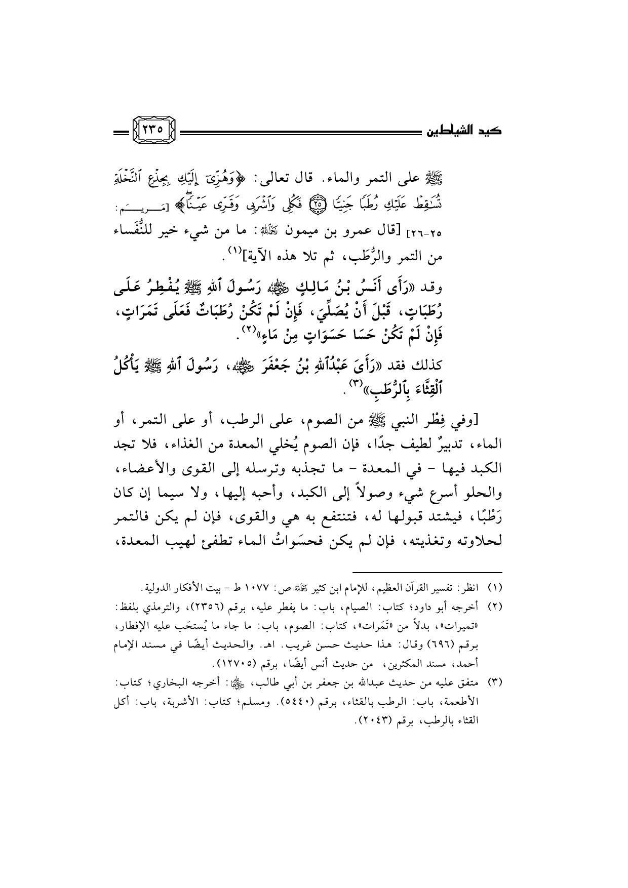 صلى الله عليه وسلم على التمر والماء. قال تعالى: [مَريَم: 25-26] {وَهُزِّي إِلَيْكِ بِجِذْعِ النَخْلَةِ تُسَاقِطْ عَلَيْكِ رُطَبًا جَنِيًّا *فَكُلِي وَاشْرَبِي وَقَرِّي عَيْناً فَإِمَّا تَرَيِنَّ مِنَ الْبَشَرِ أَحَدًا فَقُولِي إِنِّي نَذَرْتُ لِلرَّحْمَانِ صَوْمًا فَلَنْ أُكَلِّمَ الْيَوْمَ إِنْسِيًّا *} [قال عمرو بن ميمون رحمه الله: ما من شيء خير للنُّفَساء من التمر والرُّطَب، ثم تلا هذه الآية] (¬1) .