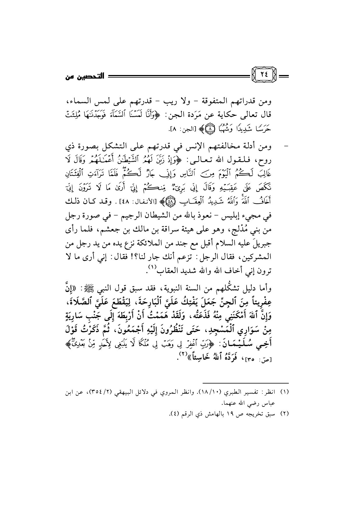 وأما دليل تشكُّلهم من السنة النبوية، فقد سبق قول النبي صلى الله عليه وسلم: إِنَّ عِفْرِيتاً مِنَ الجِنِّ جَعَلَ يَفْتِكُ عَلَيَّ الْبَارِحَةَ، لِيَقْطَعَ عَلَيَّ الصَّلاَةَ، وَإِنَّ اللهَ أَمْكَنَنِي مِنْهُ فَذَعَتُّه، وَلَقَدْ هَمَمْتُ أَنْ أَرْبِطَهَ إِلَى جَنْبِ سَارِيَةٍ مِنْ سَوَارِي الْمَسْجِدِ، حَتَى تَنْظُرُونَ إِلَيْهِ أَجْمَعُونَ، ثُمَّ ذَكَرْتُ قَوْلَ أَخِي سُلَيْمَانَ: [ص: 35] {رَبِّ اغْفِرْ لِي وَهَبْ لِي مُلْكًا لاَ يَنْبَغِي لأَِحَدٍ مِنْ بَعْدِي} ، فَرَدَّهُ اللهُ خَاسِئاً (¬2) .