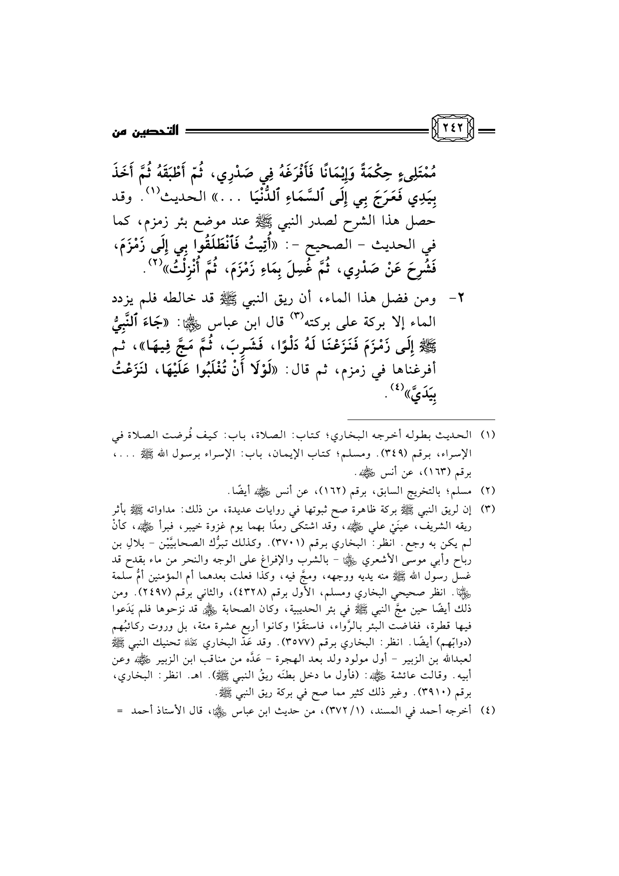 (¬4) أخرجه أحمد في المسند، (1/372) ، من حديث ابن عباس رضي الله عنهما، قال الأستاذ أحمد شاكر في شرحه للمسند (5/177) : إسناده صحيح. وقال ابن كثير في «البداية والنهاية» (5/193) : إسناده على شرط مسلم. اهـ. ... والمجّ: رميٌ بالشراب أو بالماء من الفم، ولا يكون مَجًّا حتى يباعد به. انظر: النهاية لابن الأثير (4/253) . والمقصود بالخطاب - (لولا أن تُغْلَبوا عليها) - هم بنو عبد المطّلب، لأن سقيا زمزم اختُصَّتْ بهم.